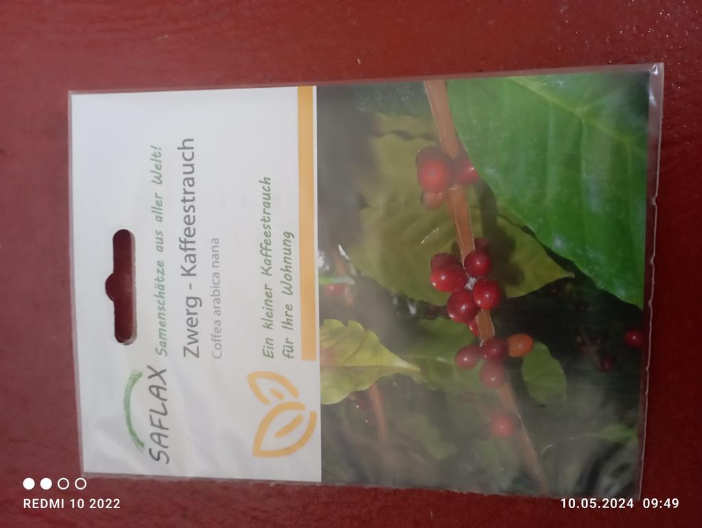 Dwarf Coffee grows in the beginning one stem and gets more bushy over time. Kept in a pot or tub, it can become up to 1,50 meters tall. Its opposite leaves are dark green coloured and shiny. After at least three years – in case of the Dwarf Coffee at a height of 40 to 50 cm – it brings out white and vanilla scented blossoms. The afterwards appearing fruits (coffee cherries) are green coloured at first, then become red and later on black. Each fruit typically contains two beans.