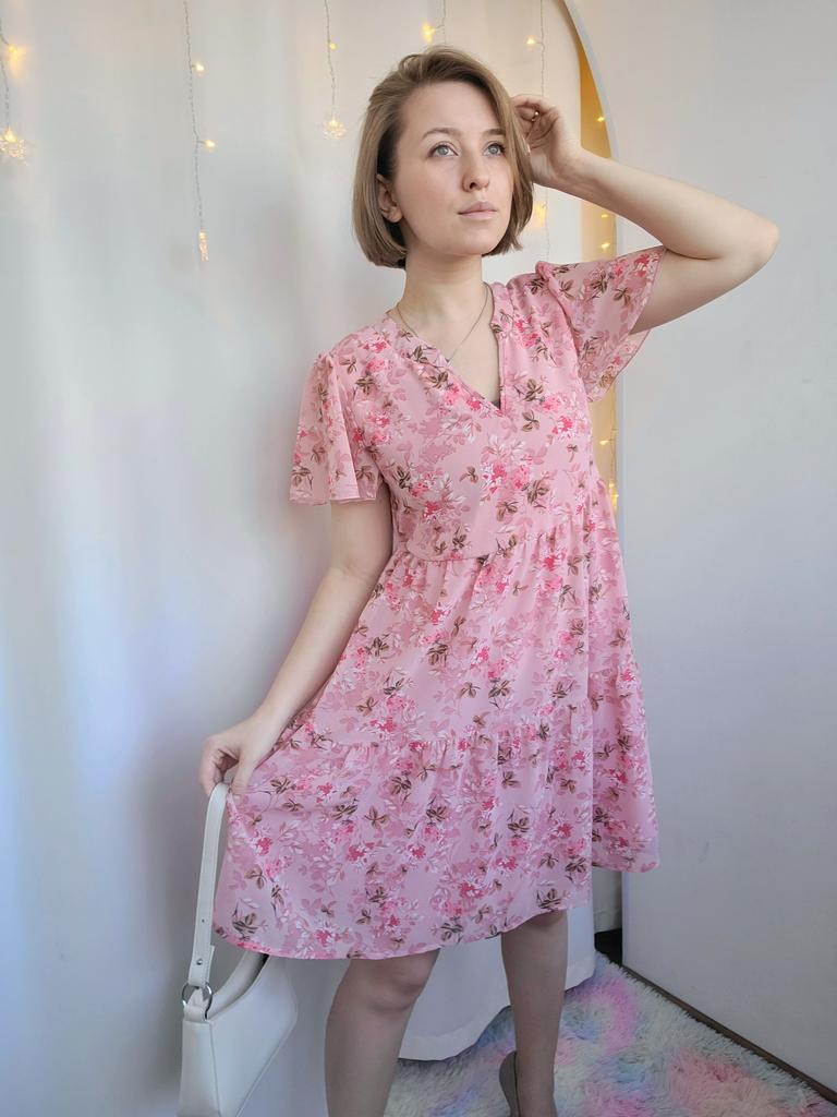 Spring Print Women Short Sleeve V Neck Floral Summer Chiffon Dress