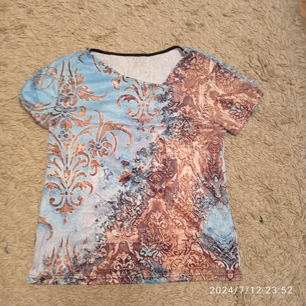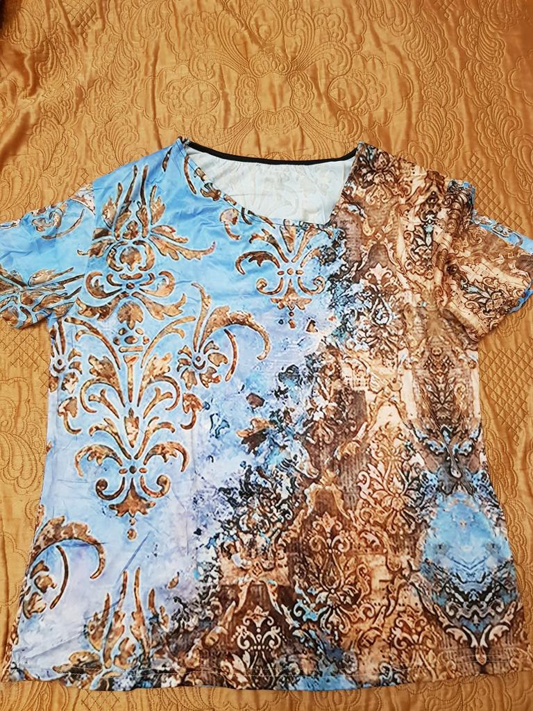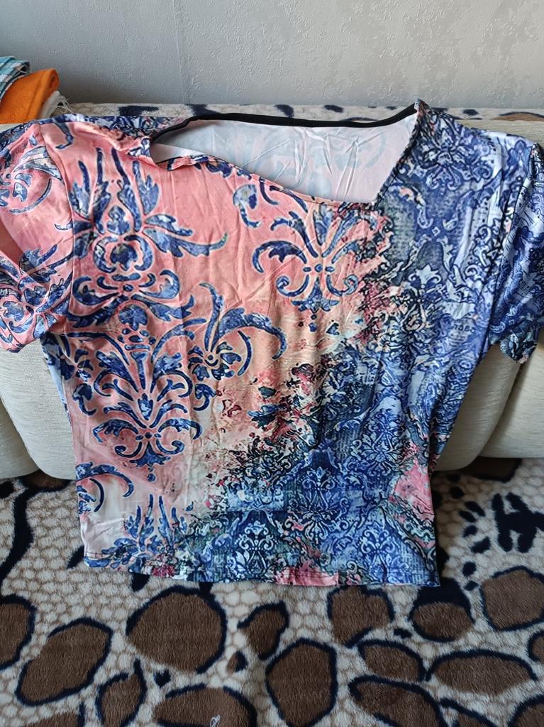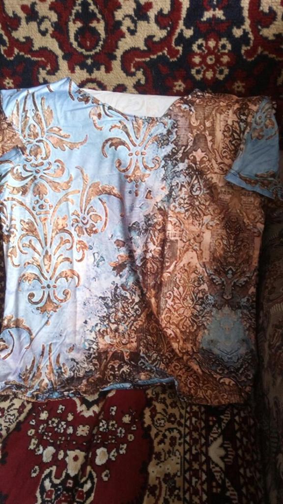The women's t-shirt is simply terrible: the pattern is blurred, the neck on the back is lined with black trim, nothing, the neckline on the front is not as shown in the picture. And on the waist - there is no waist. Disappointed.