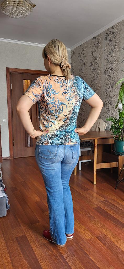 The T-shirt in the picture looks more interesting, the fabric is soft, the body is pleasant, but it looks very mediocre, walking around the house and whether there is a store, no more