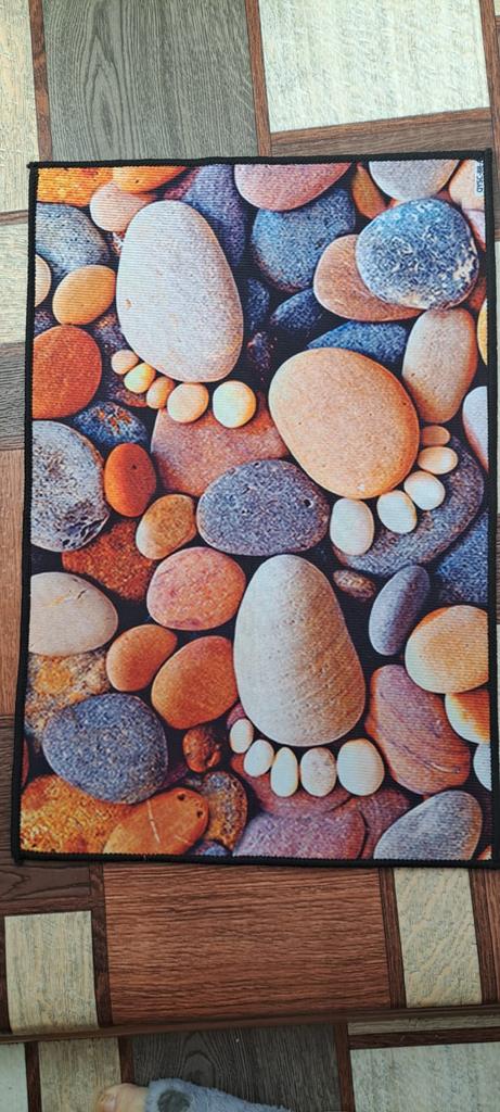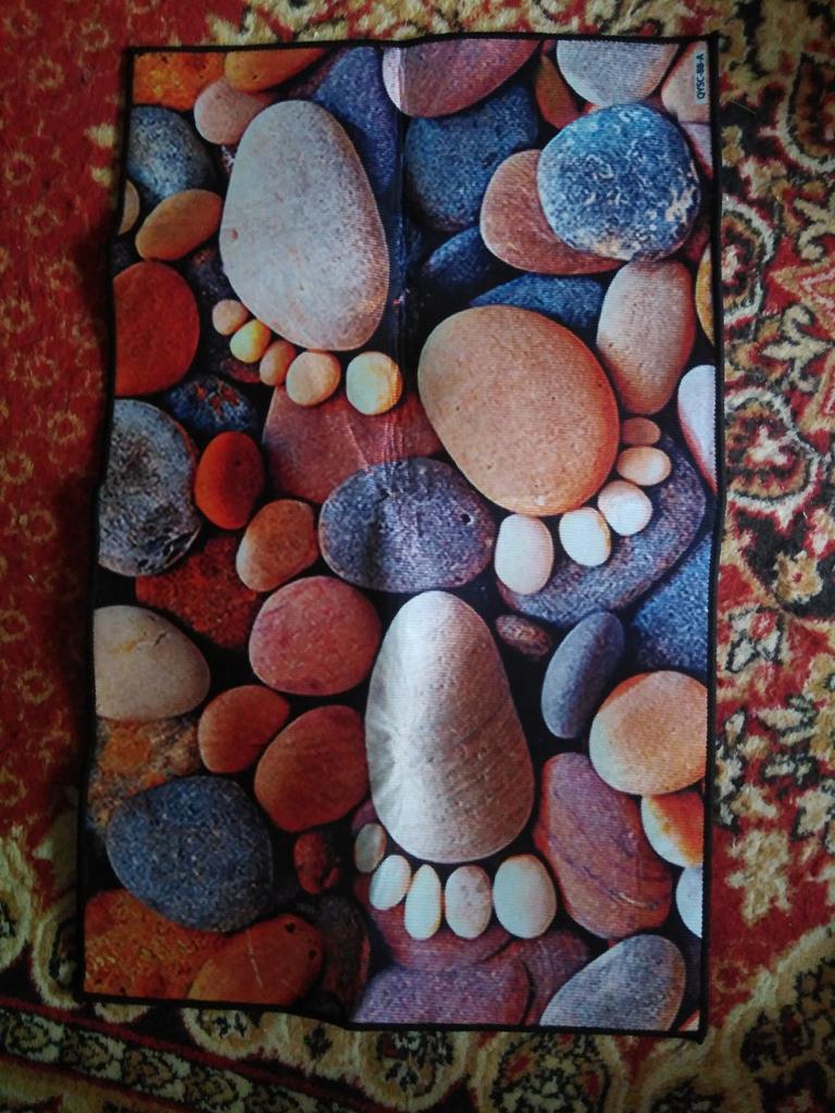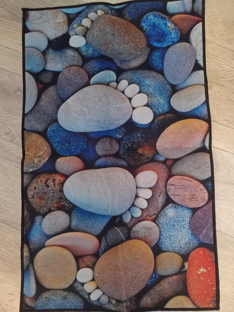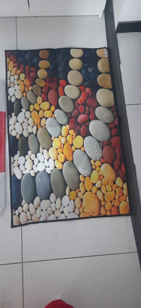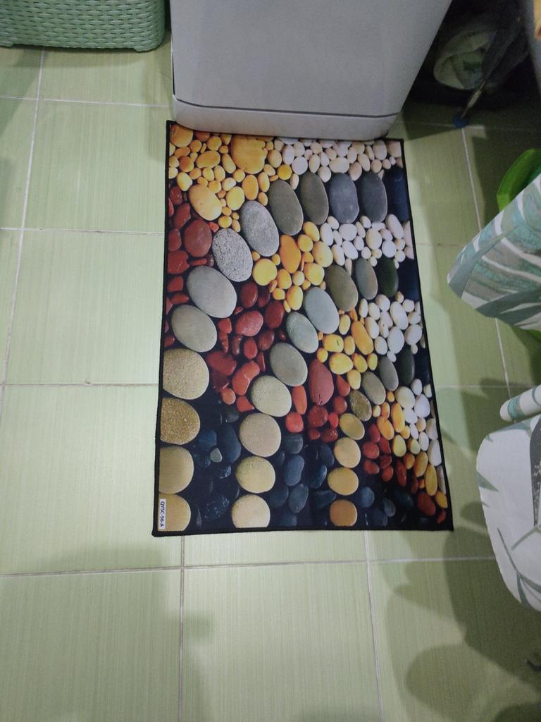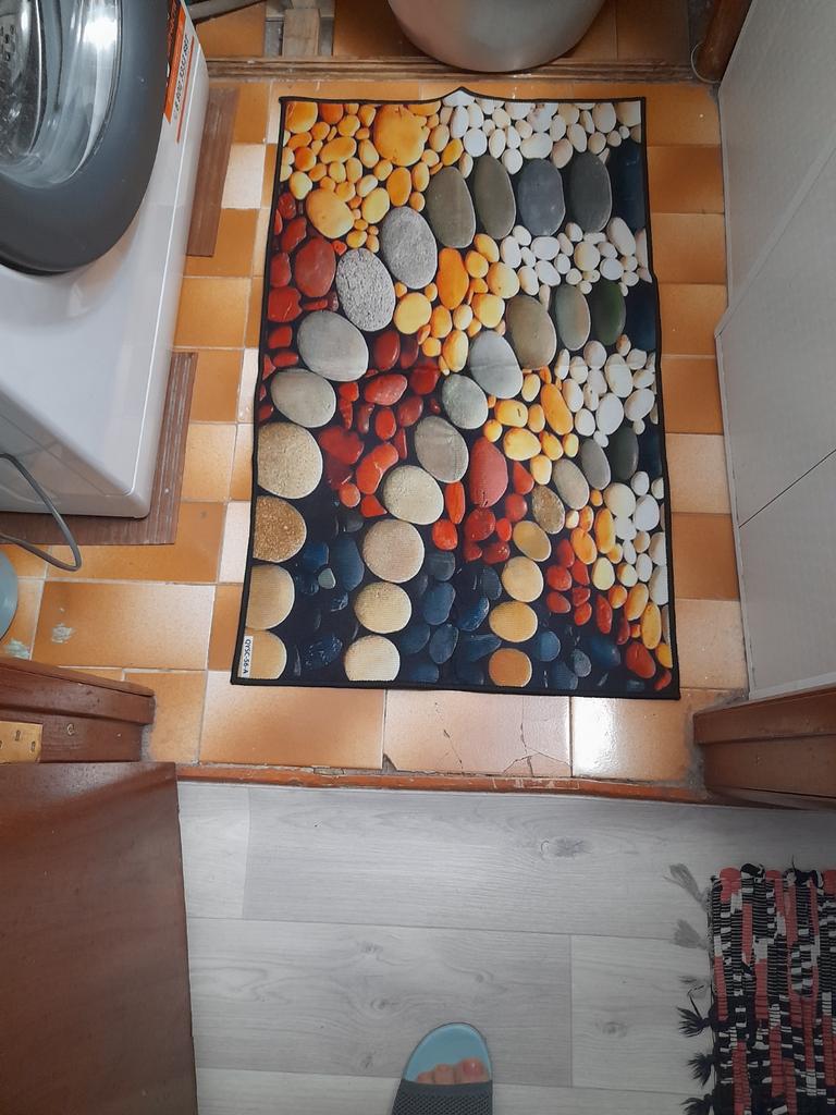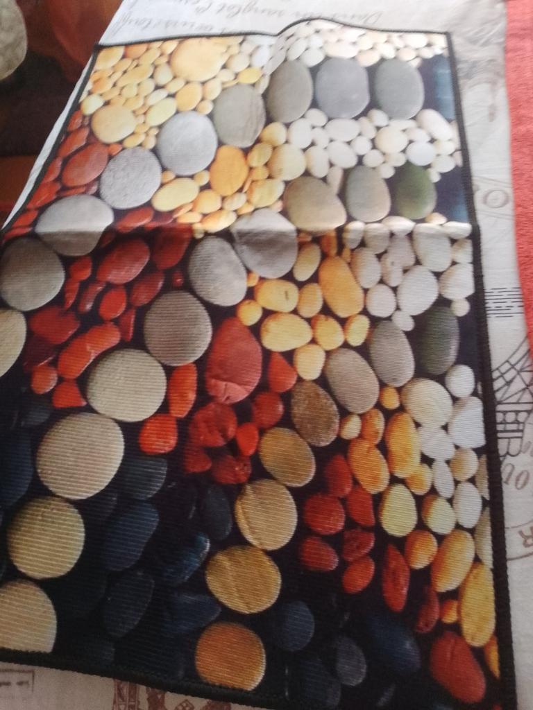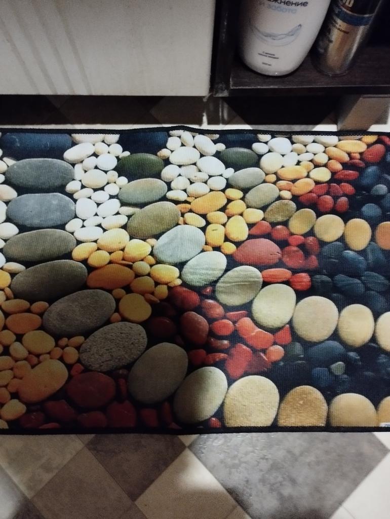 This small pebble kitchen rug is very colorful (the colors are even brighter than in the photo) and comfortable. I'm removing one star for the absence in the "full description" of any information on washing - or not washing!