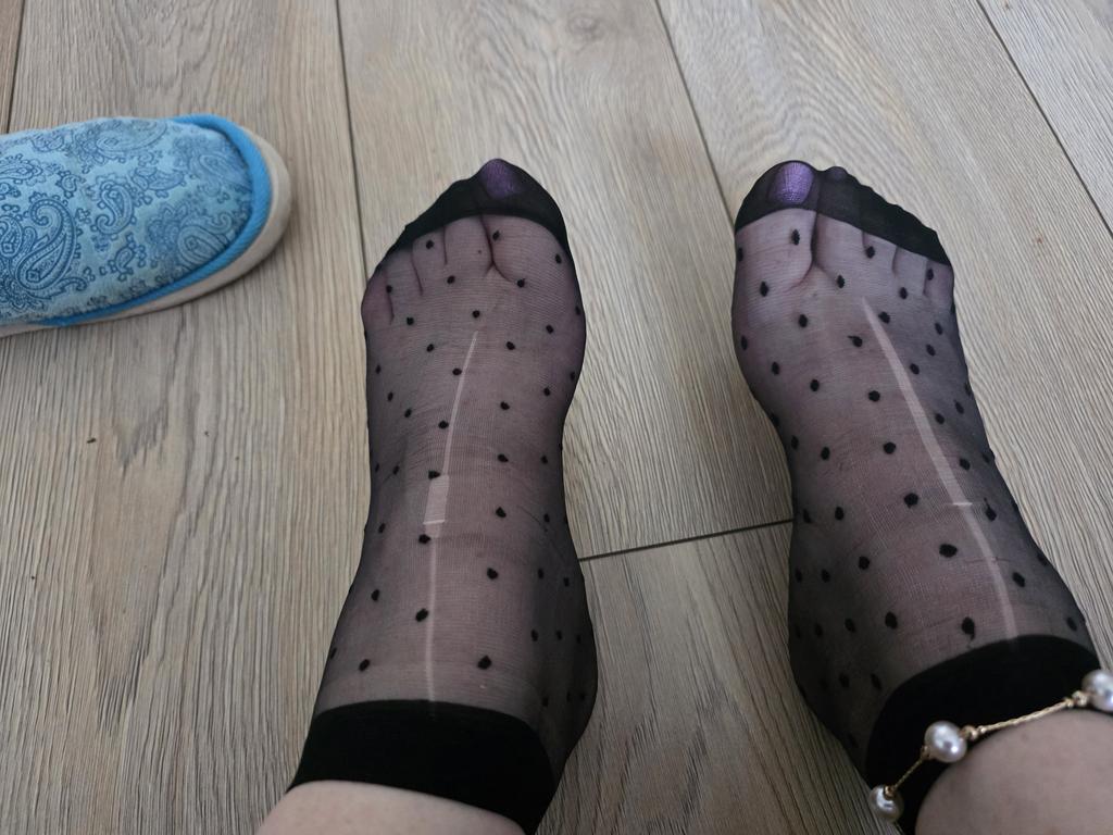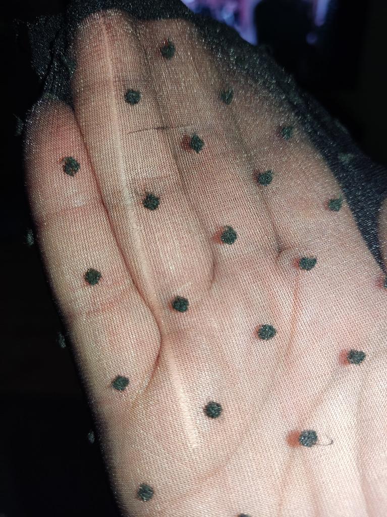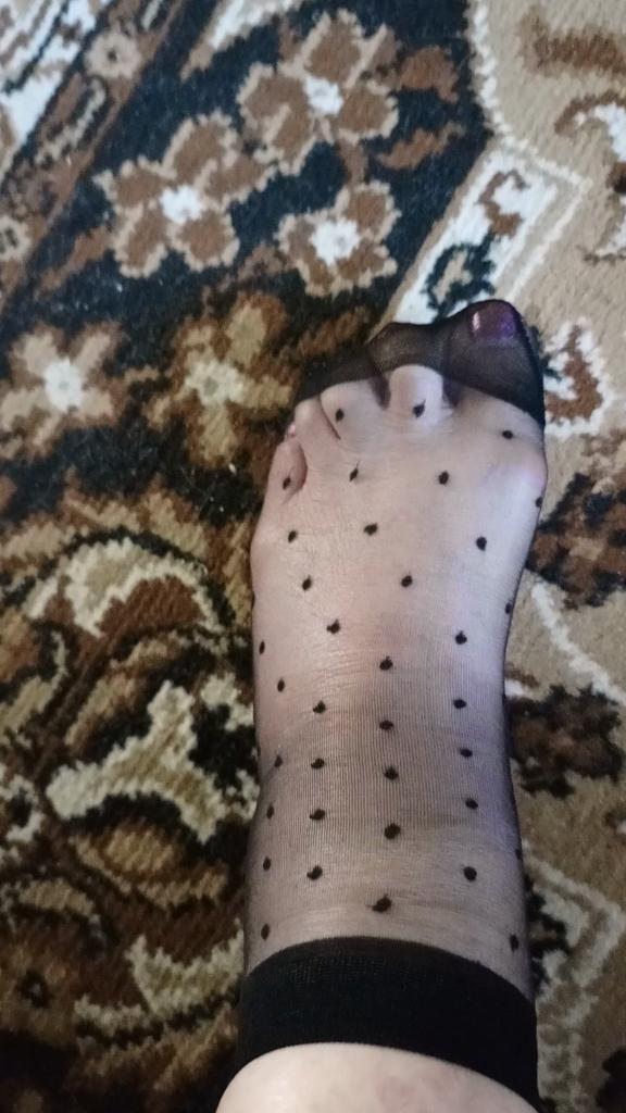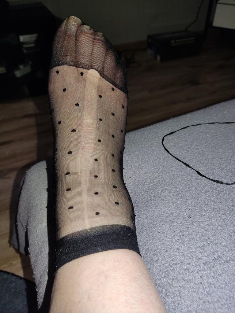 Thin black socks with polka dots.