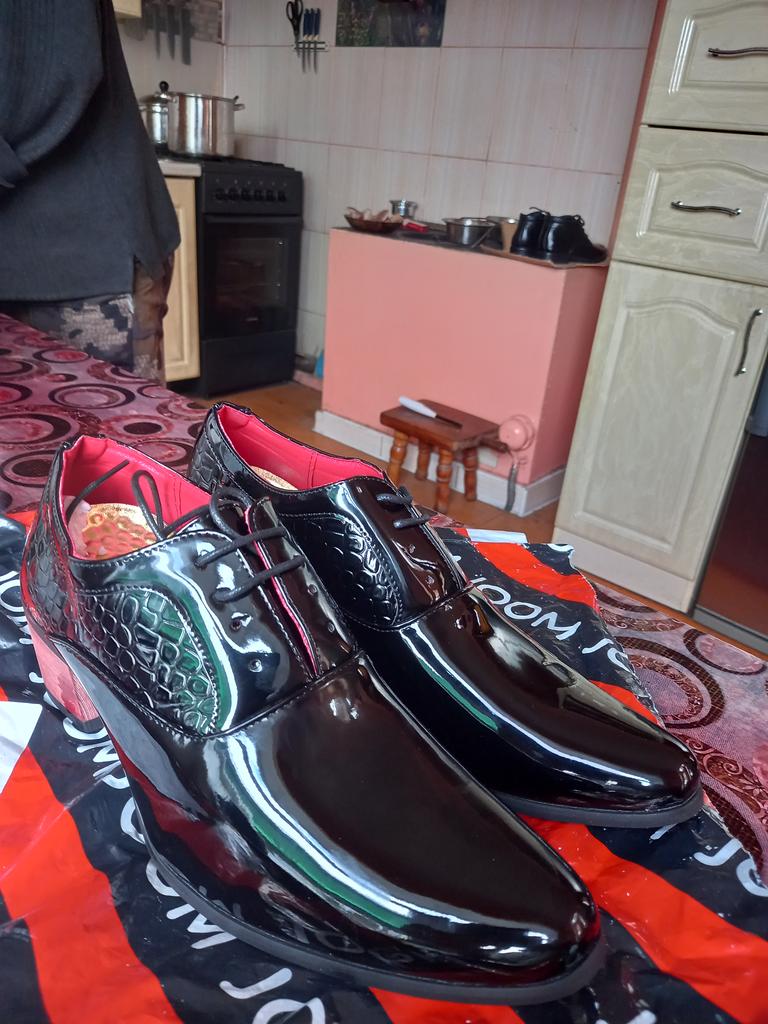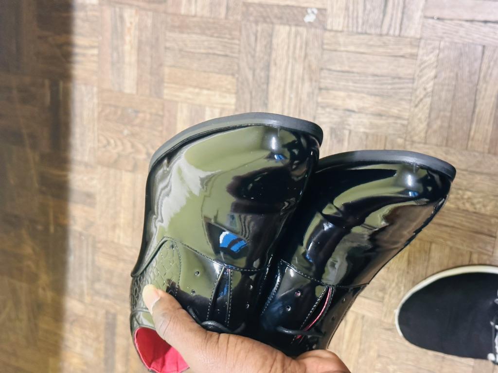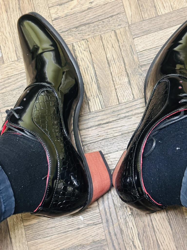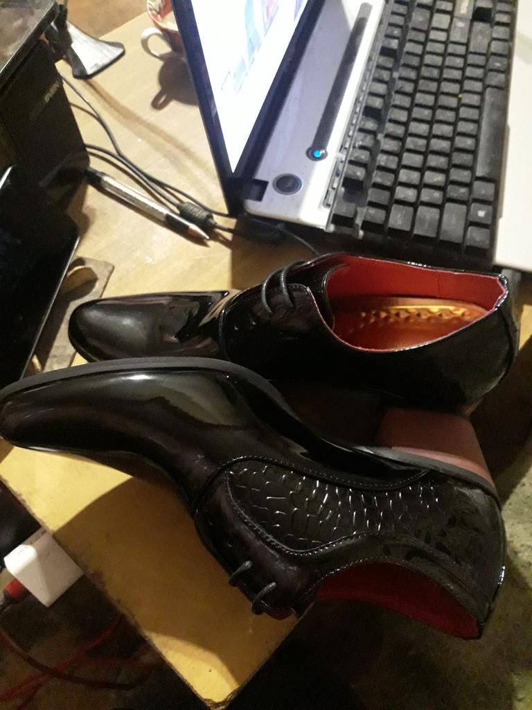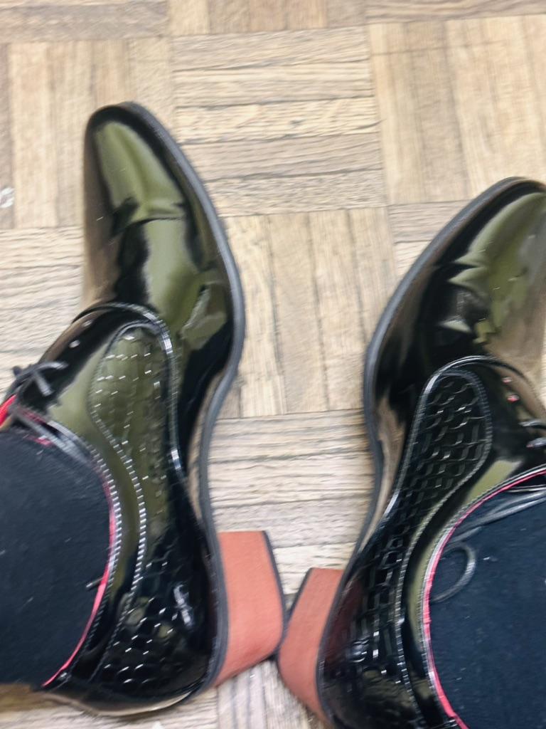 Black, half matte shoes, patent leather uppers, ordered matte. Red heel, looked black in the photo, will have to be painted