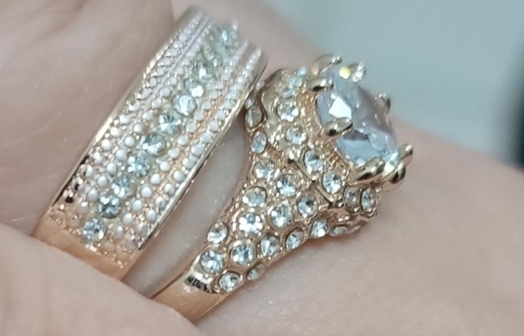 One ring with a large stone is very nice! The central stone shines well, and the stones around it shine great, but the second ring is kind of matte, whitish, you can't see the metal, I won't wear the second one!