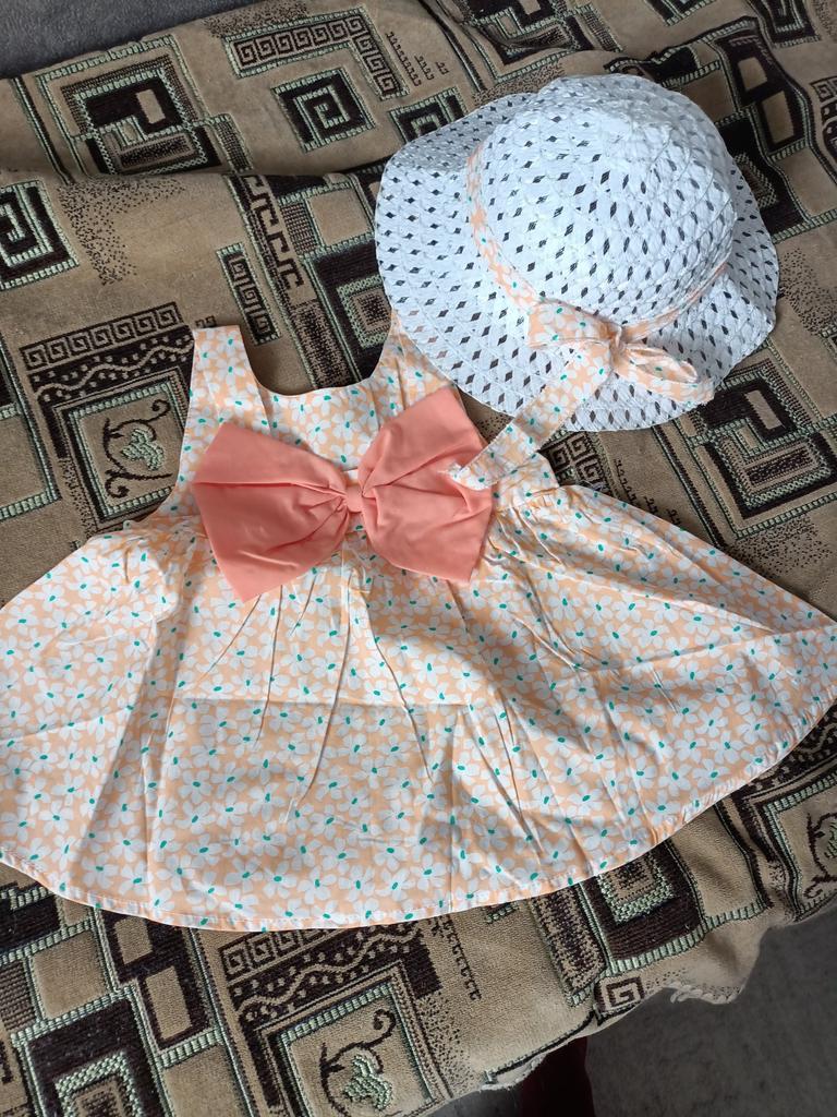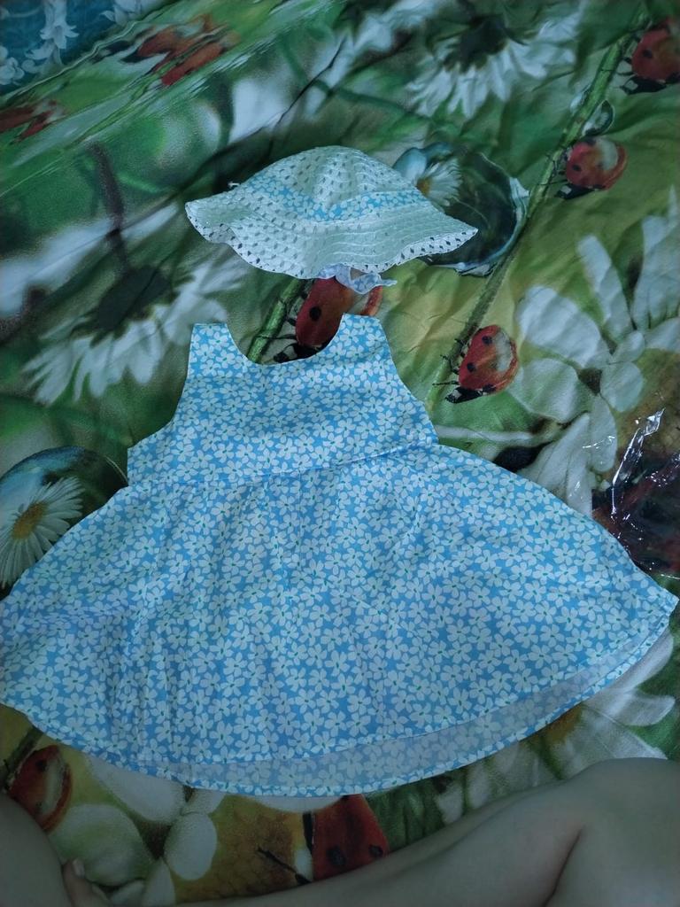 A wonderful dress, not synthetic, pleasant to the body. The hat is wrinkled and too big for 10 months The size is good and will be for next summer