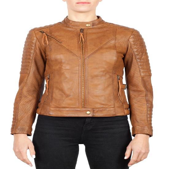NOORA Womens Tan Brown Leather Motorcycle Biker Quilted Jacket With Zipper & Pocket | Snap On Collar |