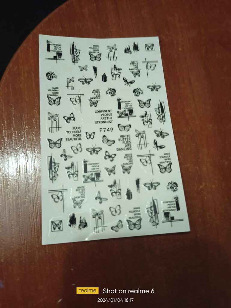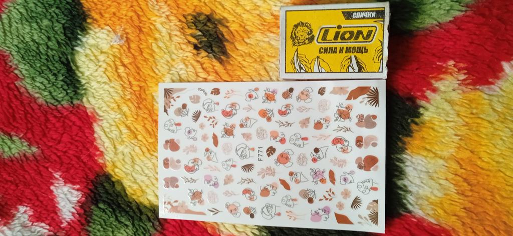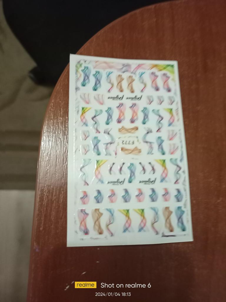 Good evening . I received the stickers in the same color as in the picture, but they are long in size for my short nails, I cut the picture in half and they will be longer for me. Thank you to the seller for the product.