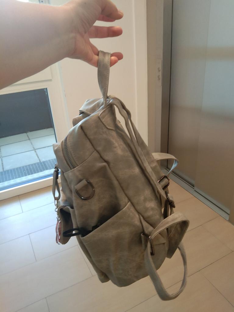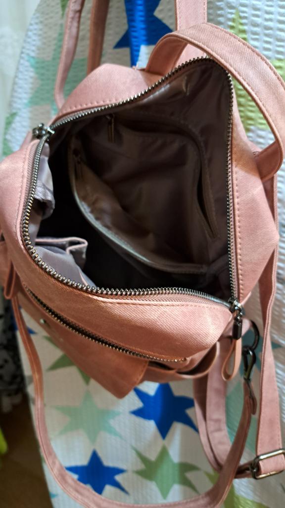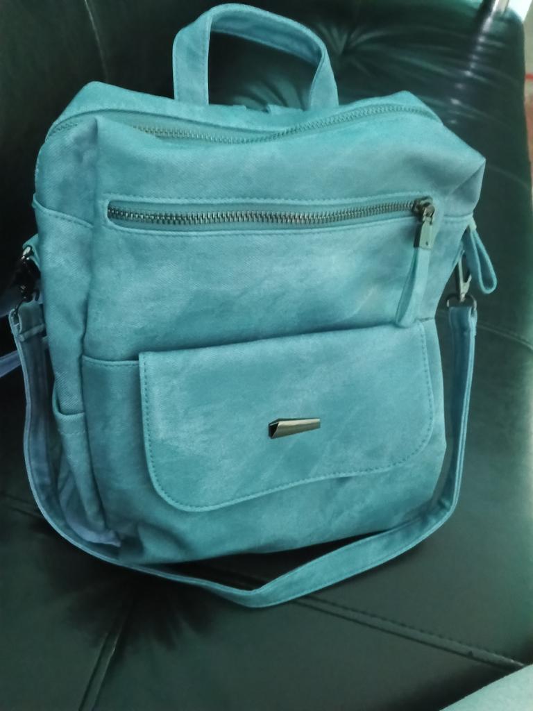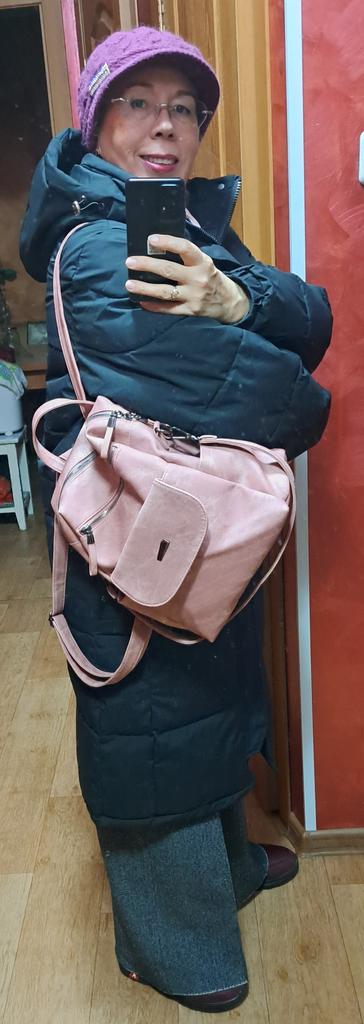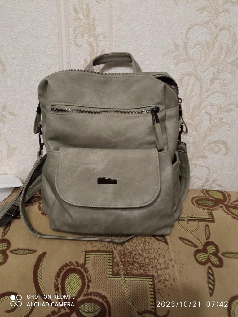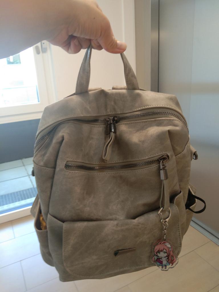 The backpack is just great! The only thing is that the glue stinks a lot, I took it out to the balcony to air out a little. It is not too big and not too small, roomy, but not bulky, as it should be. The material resembles artificial leather, but it is not. Seems to be waterproof. There are many pockets inside, the fasteners are intact, they work fine, no complaints. The lining is whole. I recommend it before buying, but be prepared for the fact that it will stink the first time