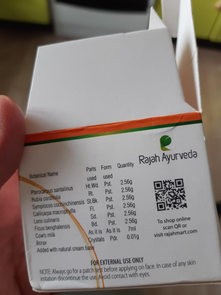 манжишта (indian madder), красный сандал (red sanders), костус (costus), лодхра (lodh), красивоплодник (beauty berry), почки баньяна (banyan buds), чечевица (lentil seeds), коровье молоко (cow's milk), кокосовое масло (coconut oil), миндальное масло (almond oil), оливковое масло (olive oil), масло какао (cocoa butter).