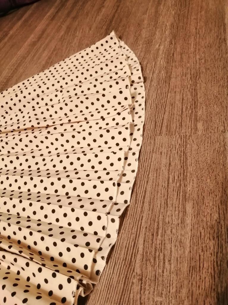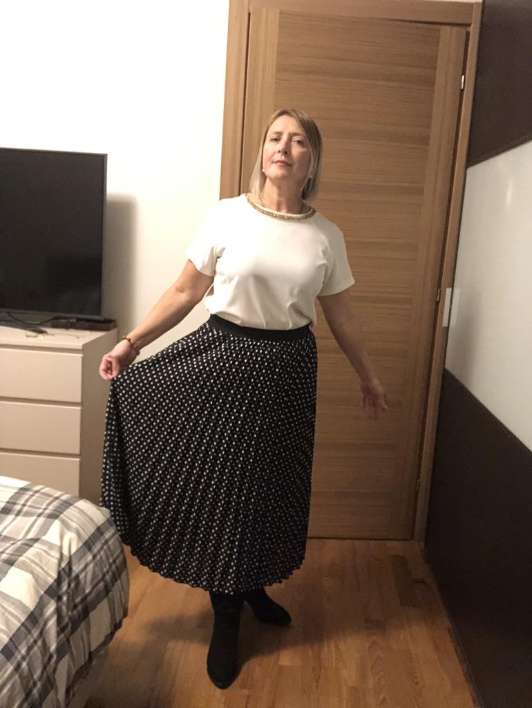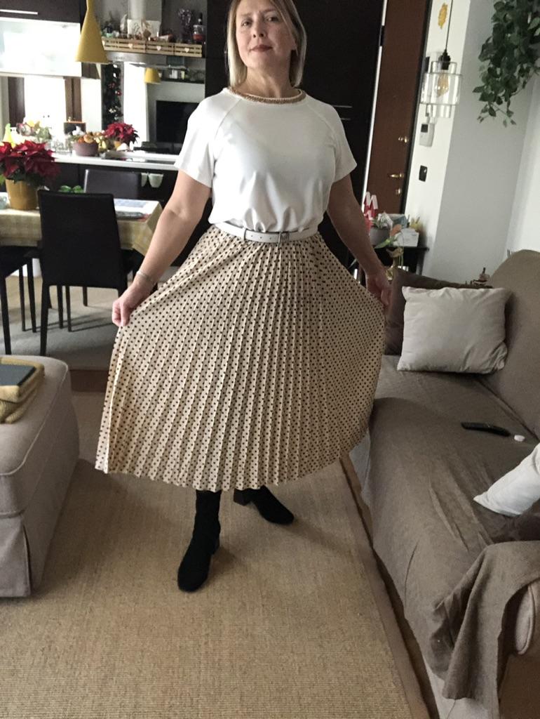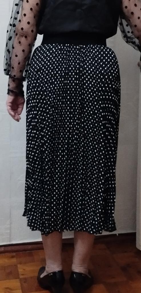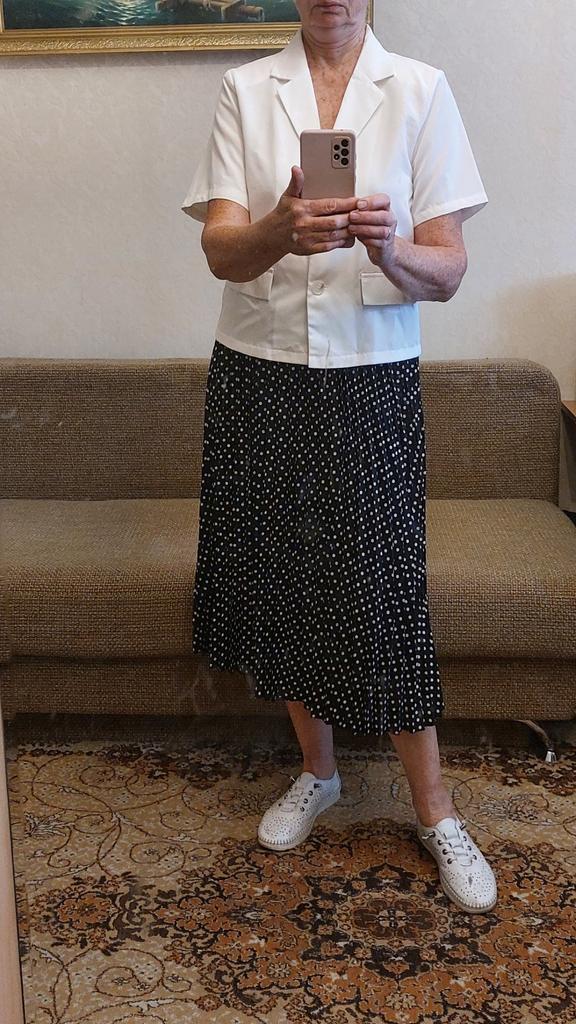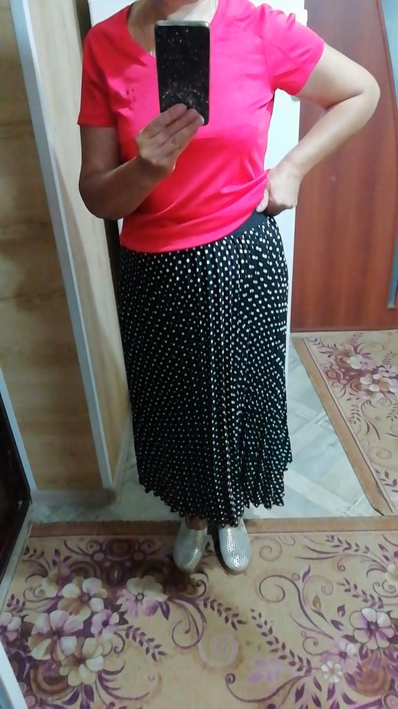 The skirt fits my OB-120 very well, the pleats lie nicely, it doesn’t make me look fat, the elastic is a little tight, I’m going to sew on another one with a larger volume so that it doesn’t press, but I wear it like that. The fabric is good, light, it was fine in the heat. I wore it with pleasure. I recommend.