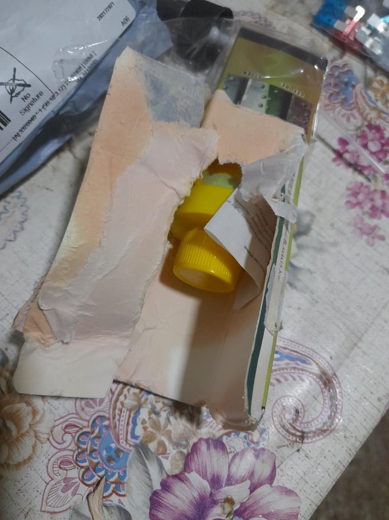 The bottle is open. The contents are all over the parcel. The rest of the goods are well packed and almost undamaged. Lucky.