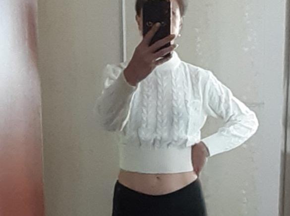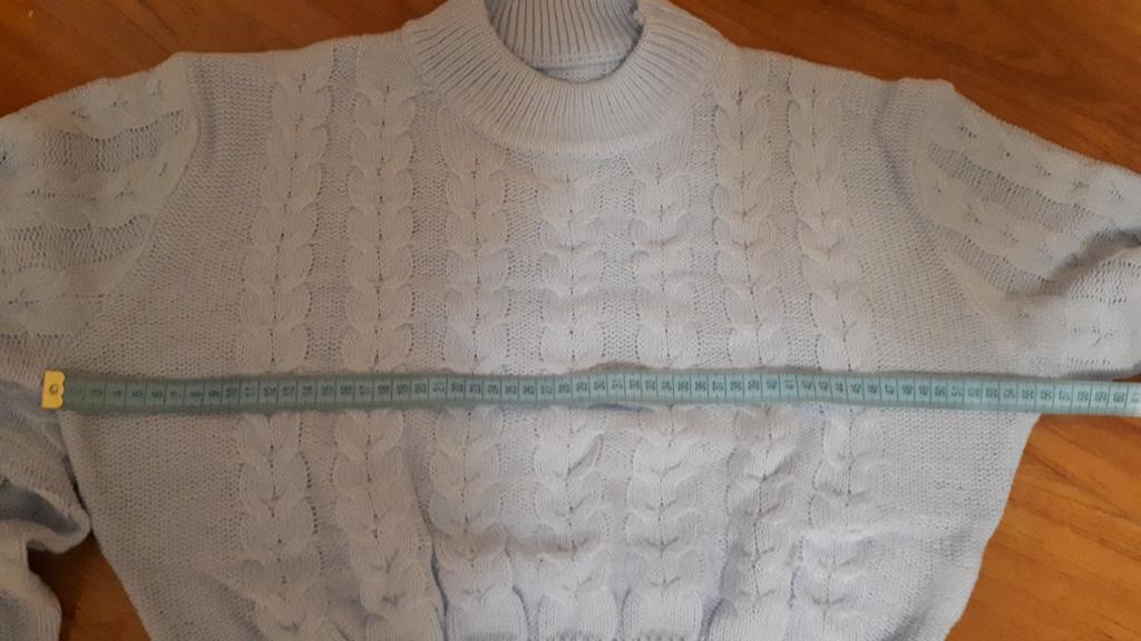Excellent jumper. Short, to the waist. Skirt waistband, closes trousers. Soft. The color is soft blue. Very pleased. Thank you!