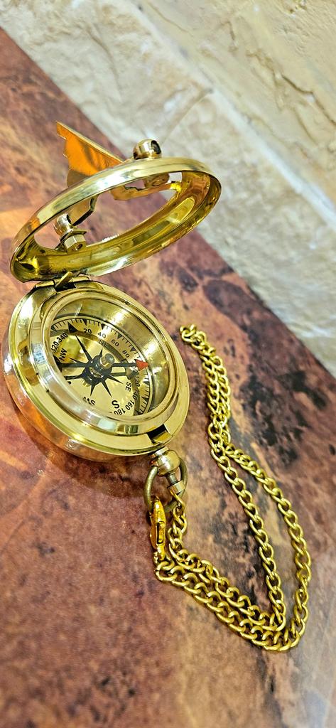 Vintage style compass from India This is a handmade item. Made from brass. Combines a sundial and a compass. Looks very decent. The lid opens by pressing a button. The compass shows everything correctly. Can be bought as a gift. It will look ideal as an interior item in an office. I recommend purchasing with all my heart.!