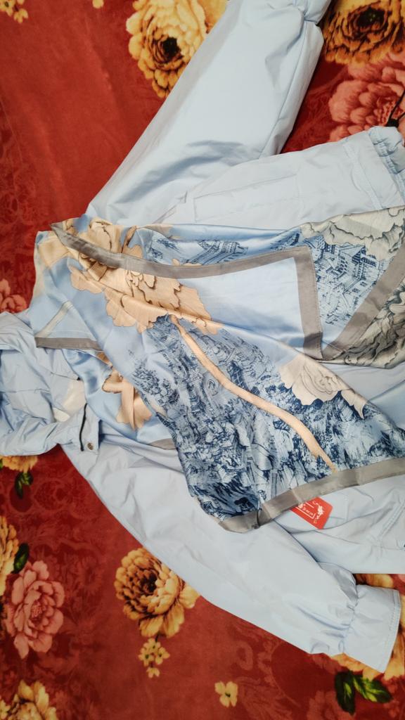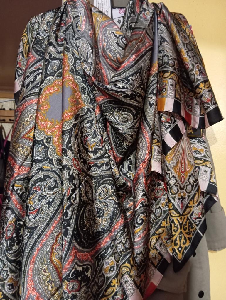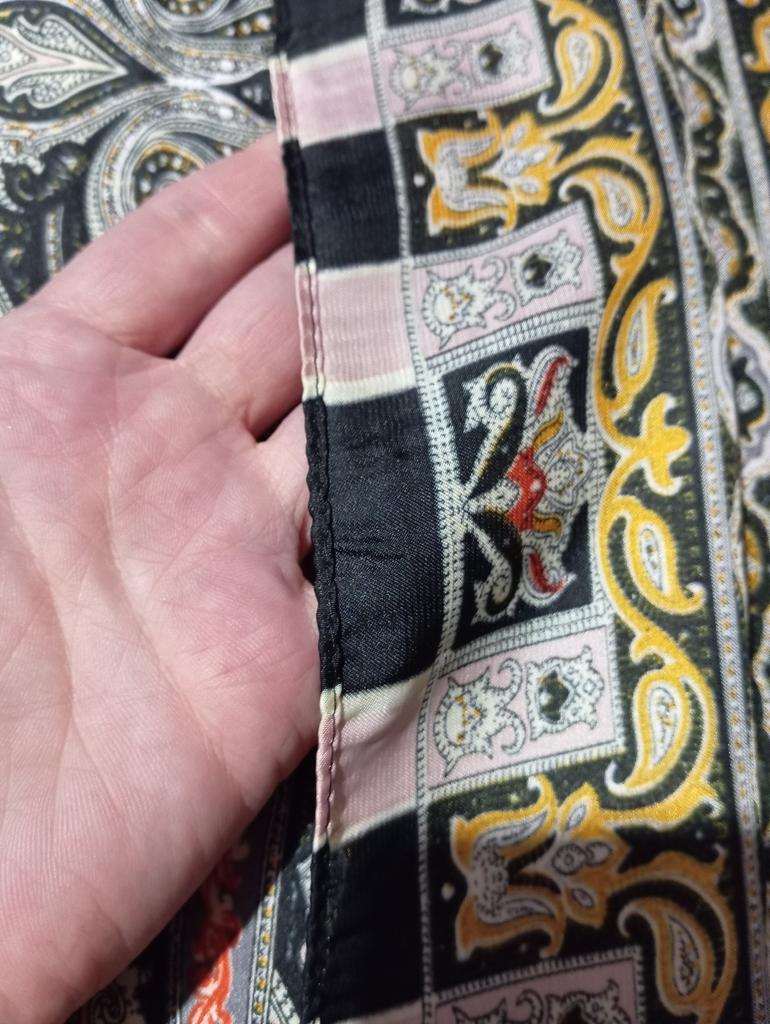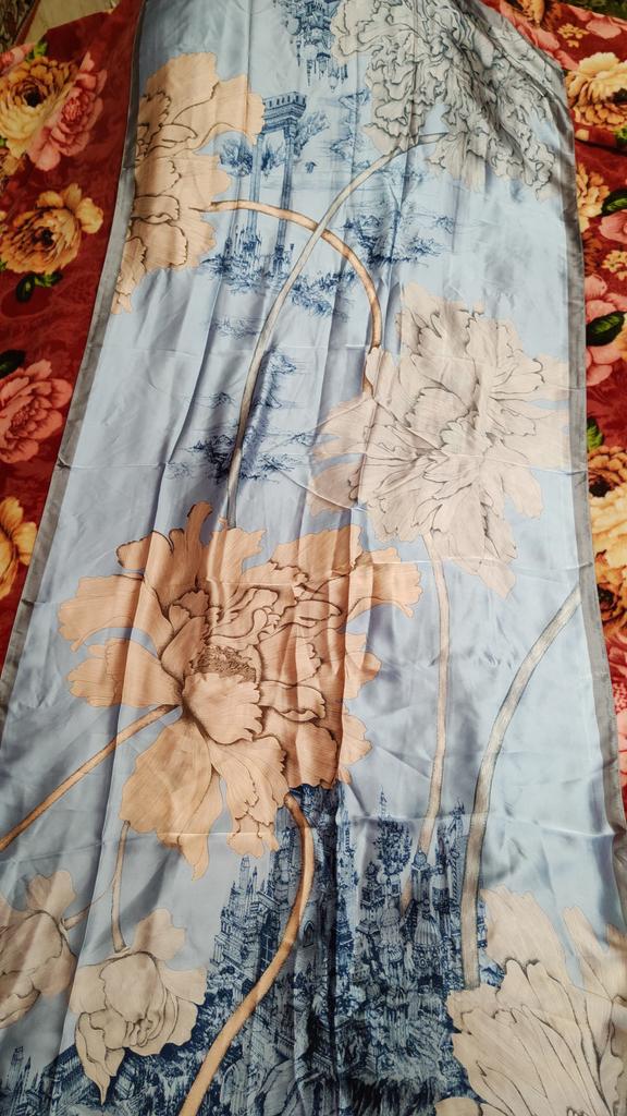 Very beautiful scarf, I wanted to sew a summer blouse from it, but changed my mind - it matched the color of the jacket perfectly. The quality is very good, the seams are even without creases.