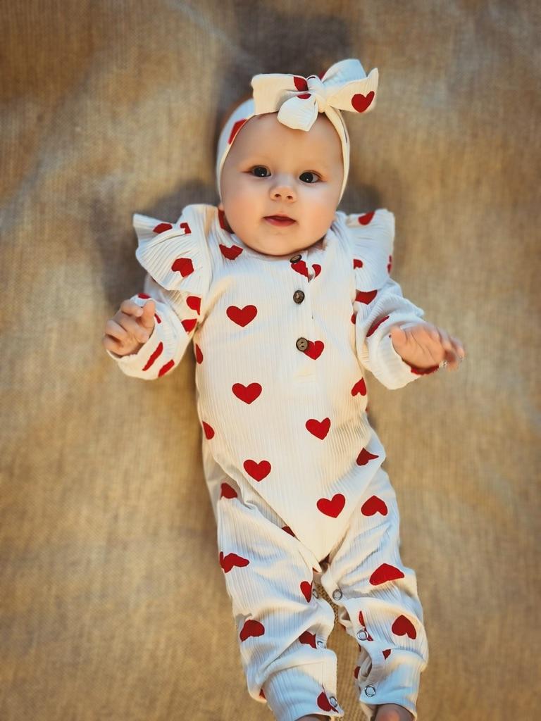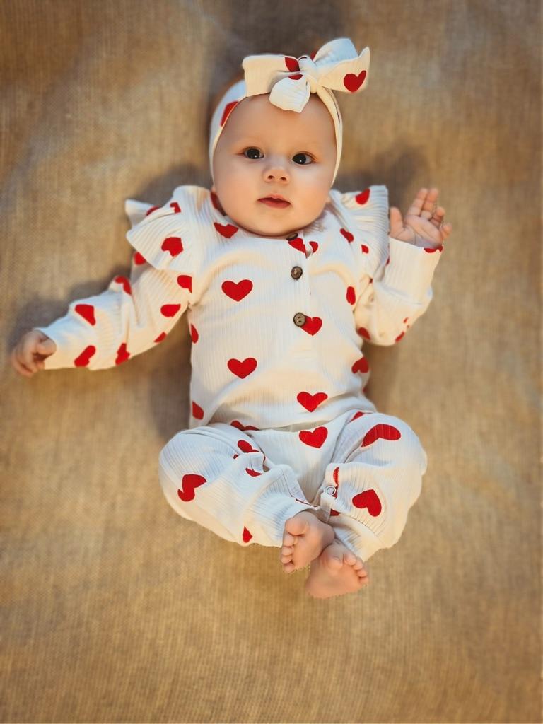 Infant Girls Two-piece Clothes Set, Heart Print Long Sleeve Crew Neck Romper and Bow Knot Headdress, Pink/ White