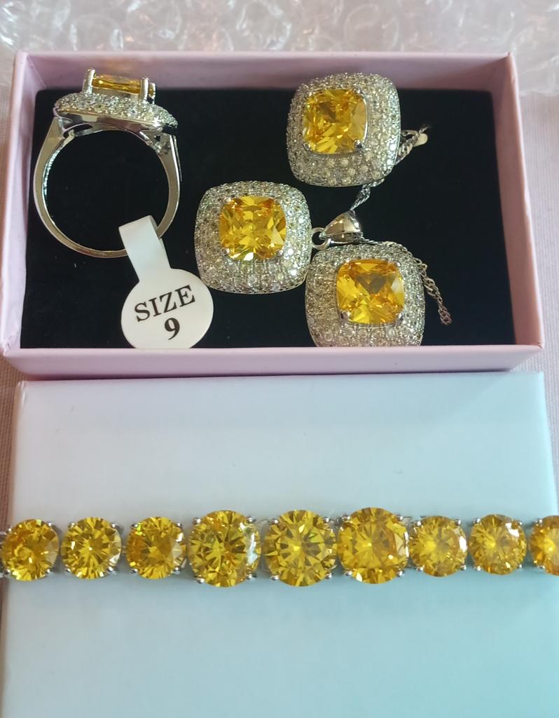 I'm very pleased with the set. The stones shine, everything is in place, everything fastens well. It looks expensive and rich. The ring also fit. Packed perfectly. Thank you so much everyone.
