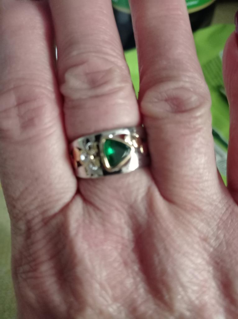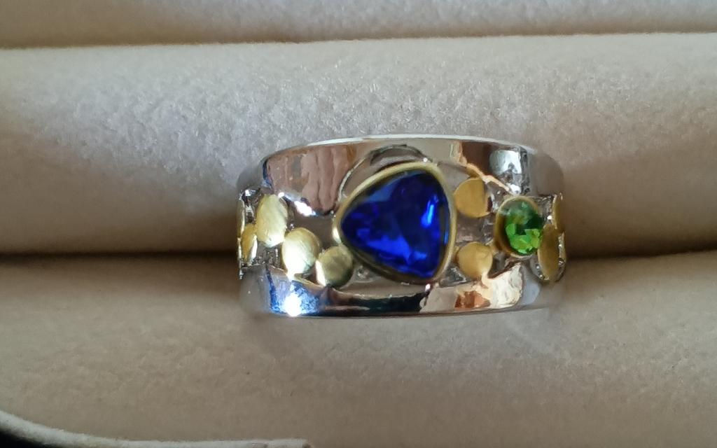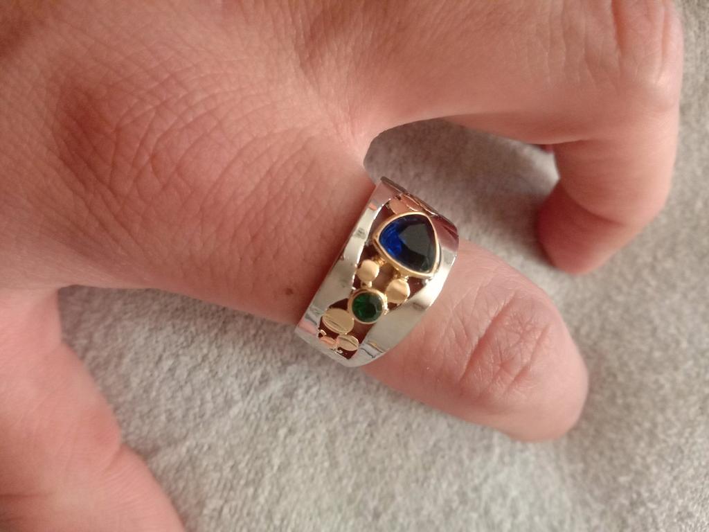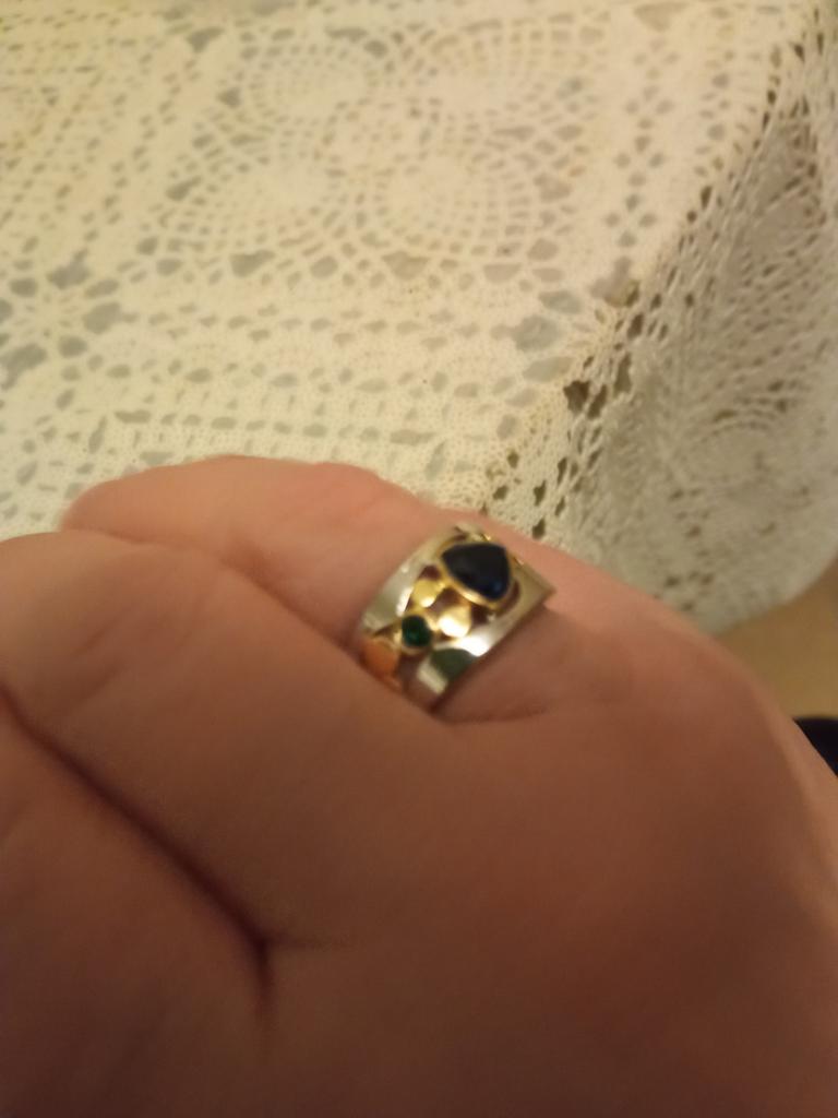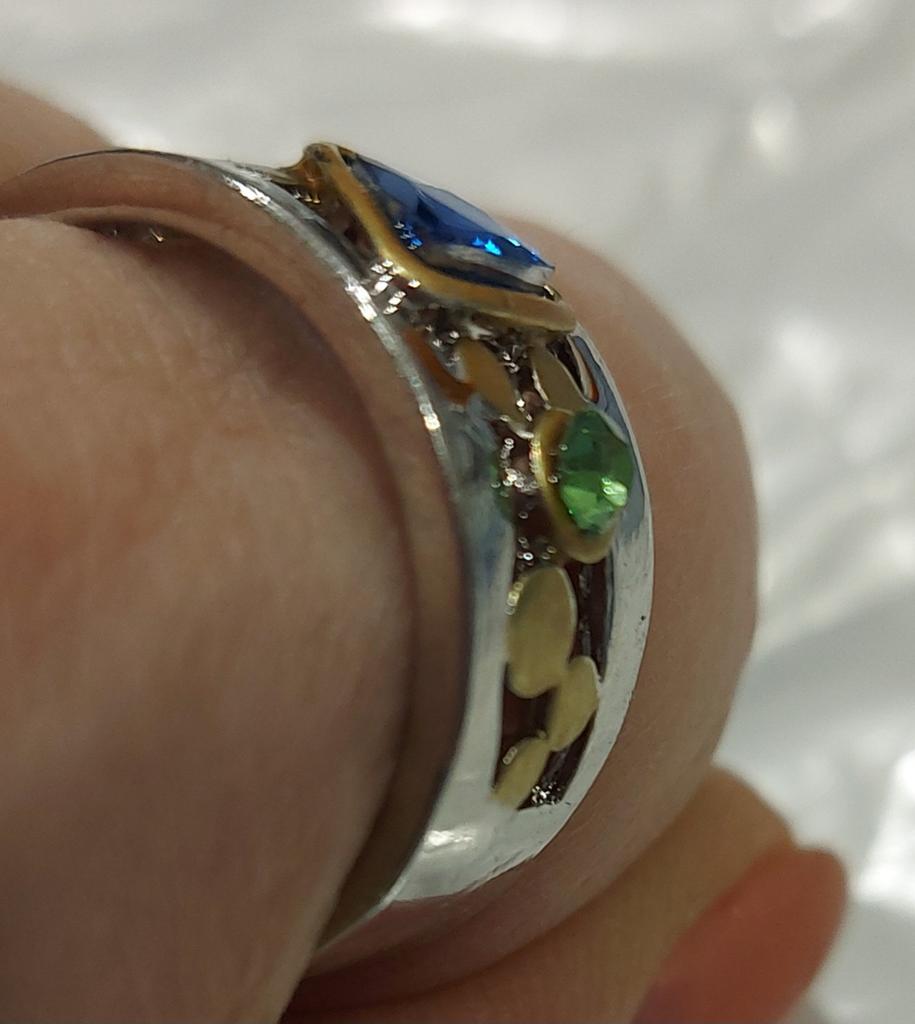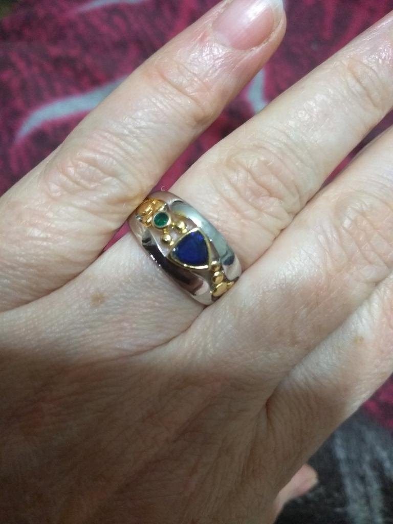 The ring is interesting - a combination of white and yellow metals, beautiful, bright green and blue stones...