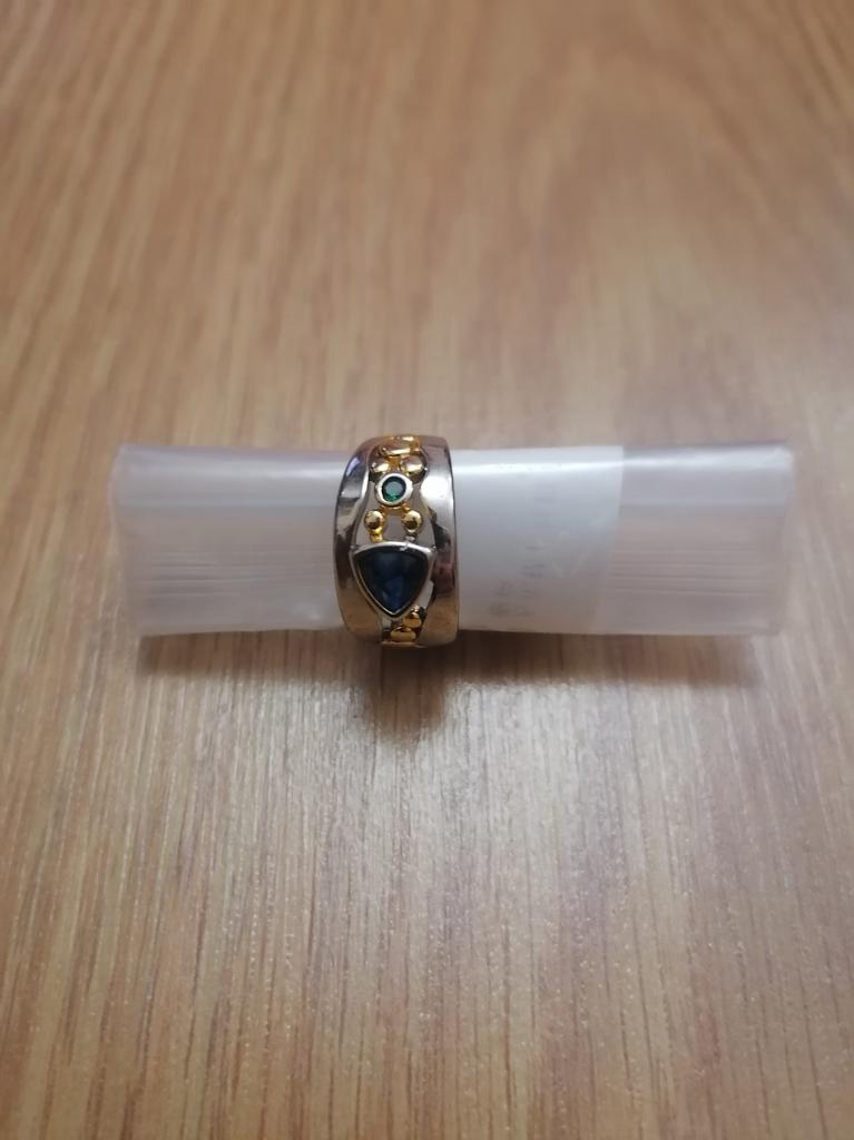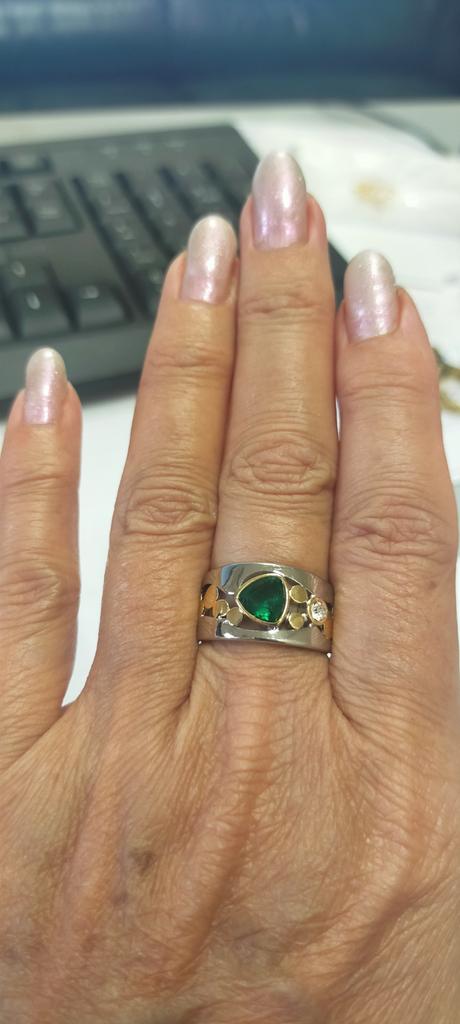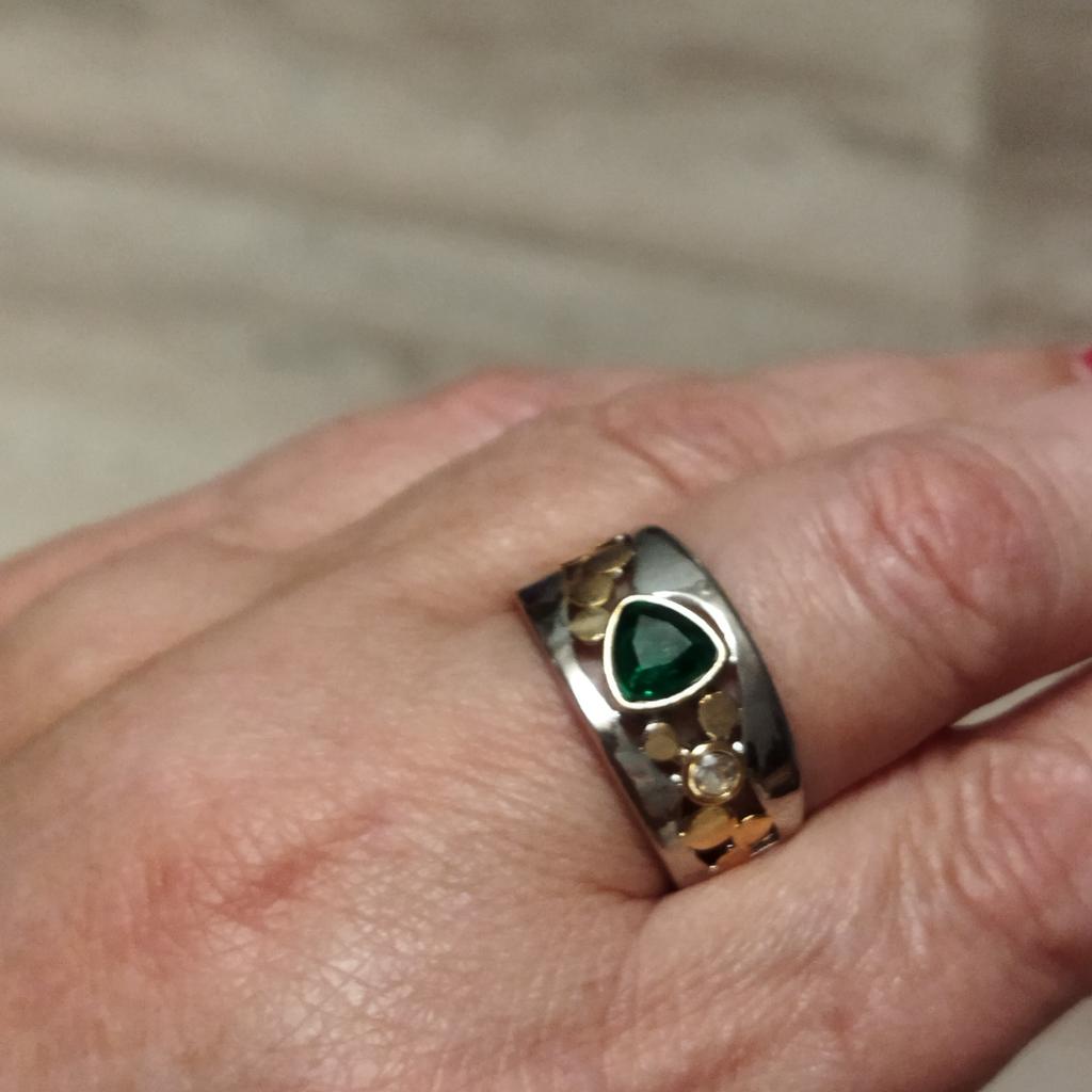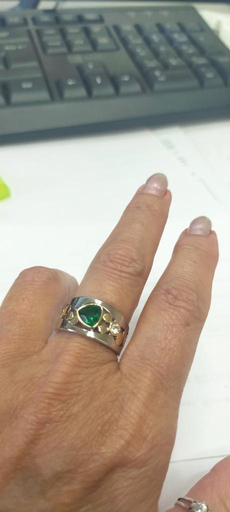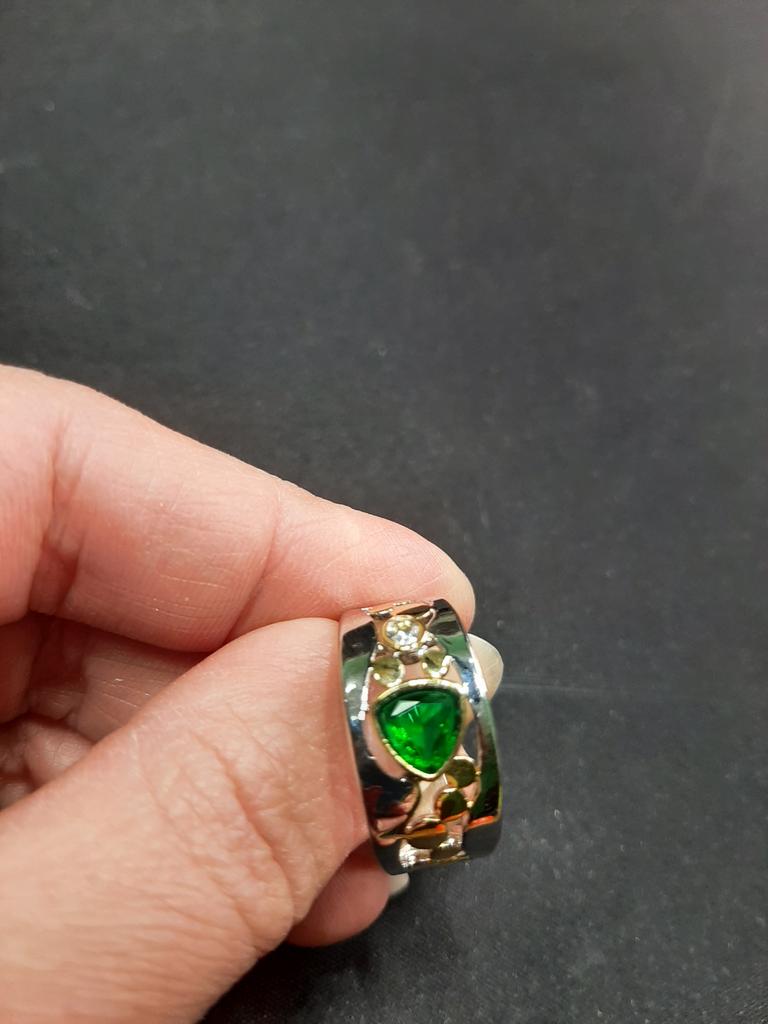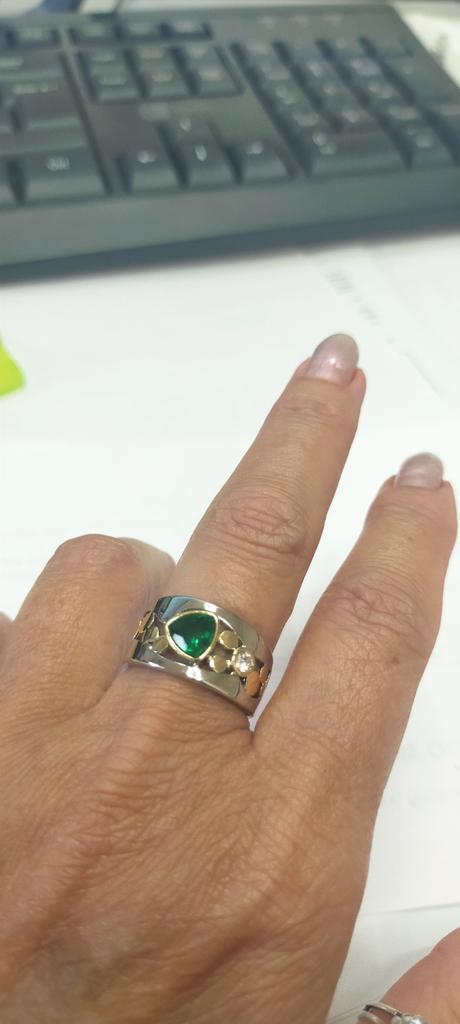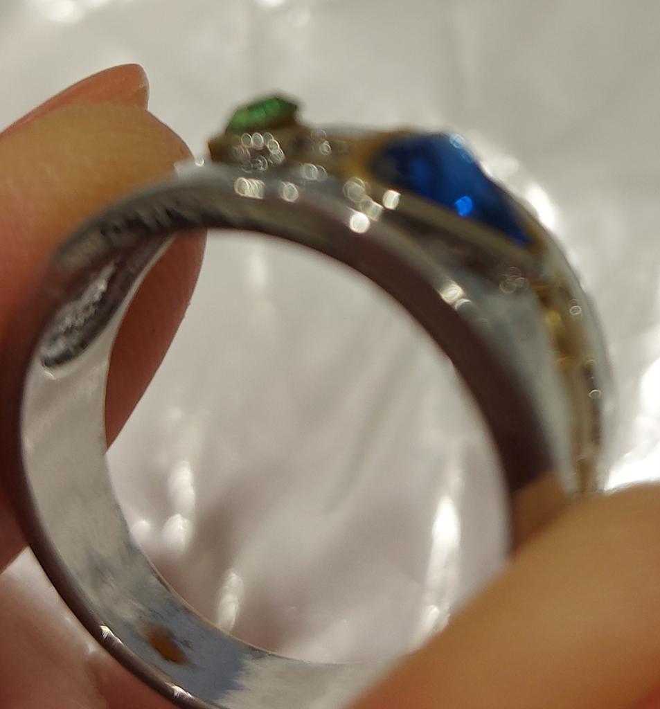 The ring is interesting - a combination of white and yellow metals, beautiful, bright green and blue stones...