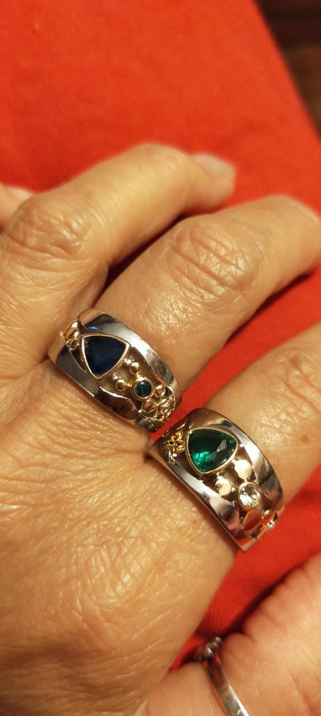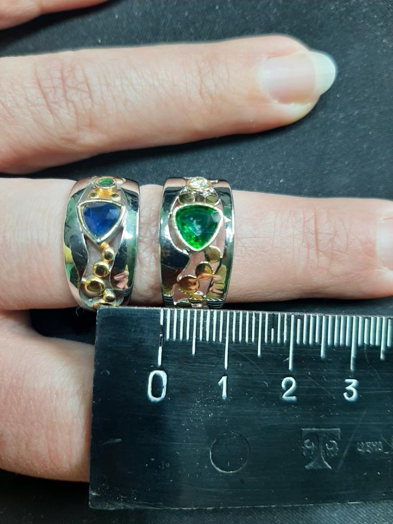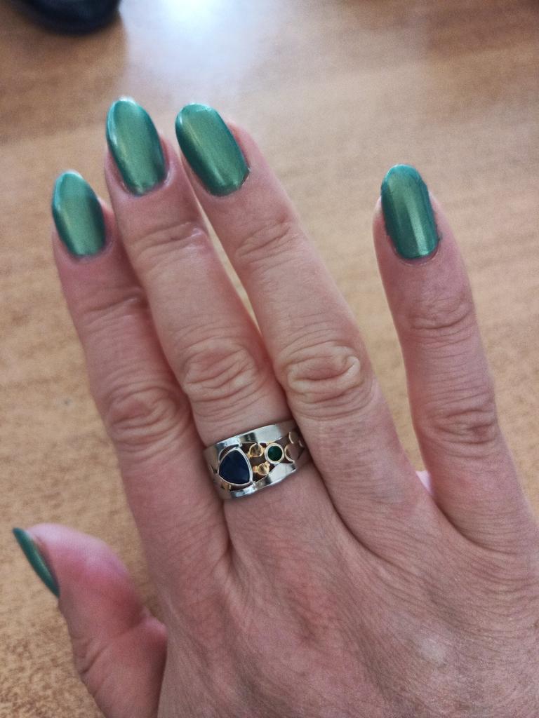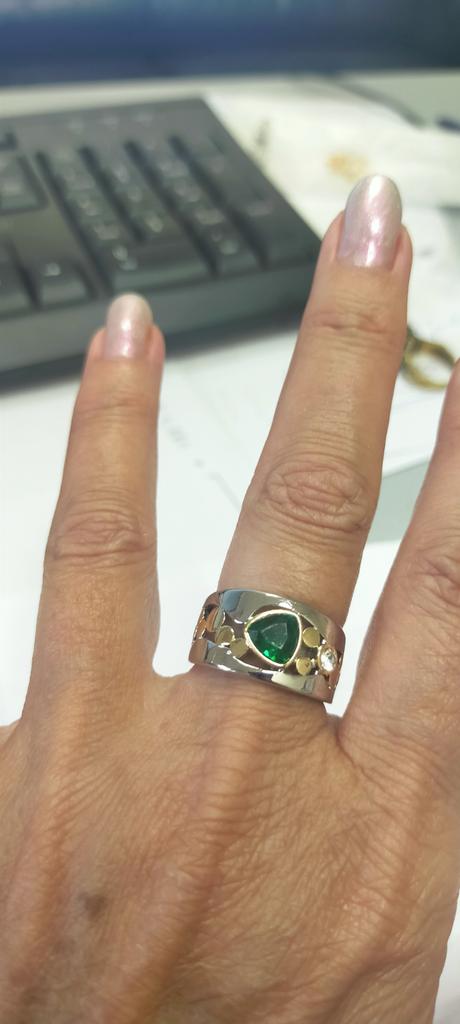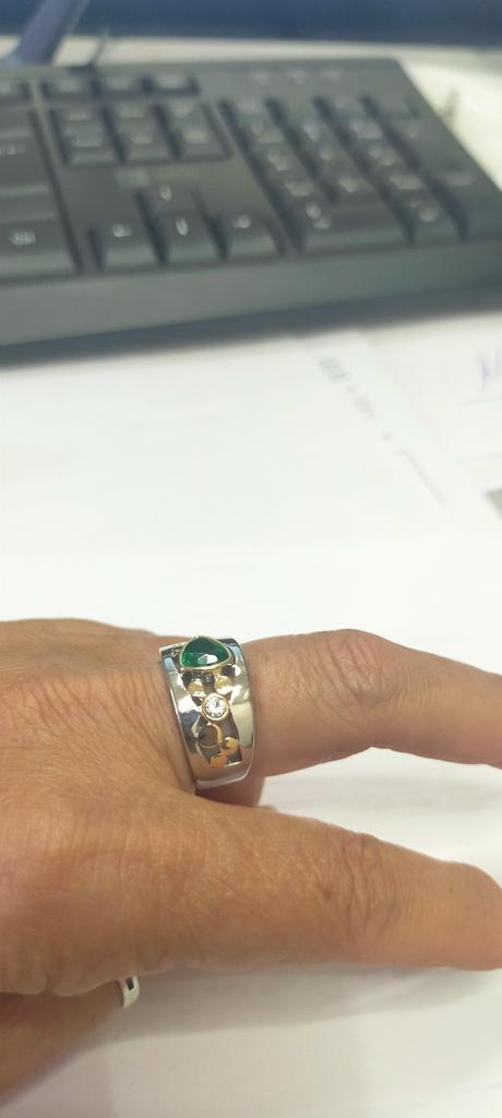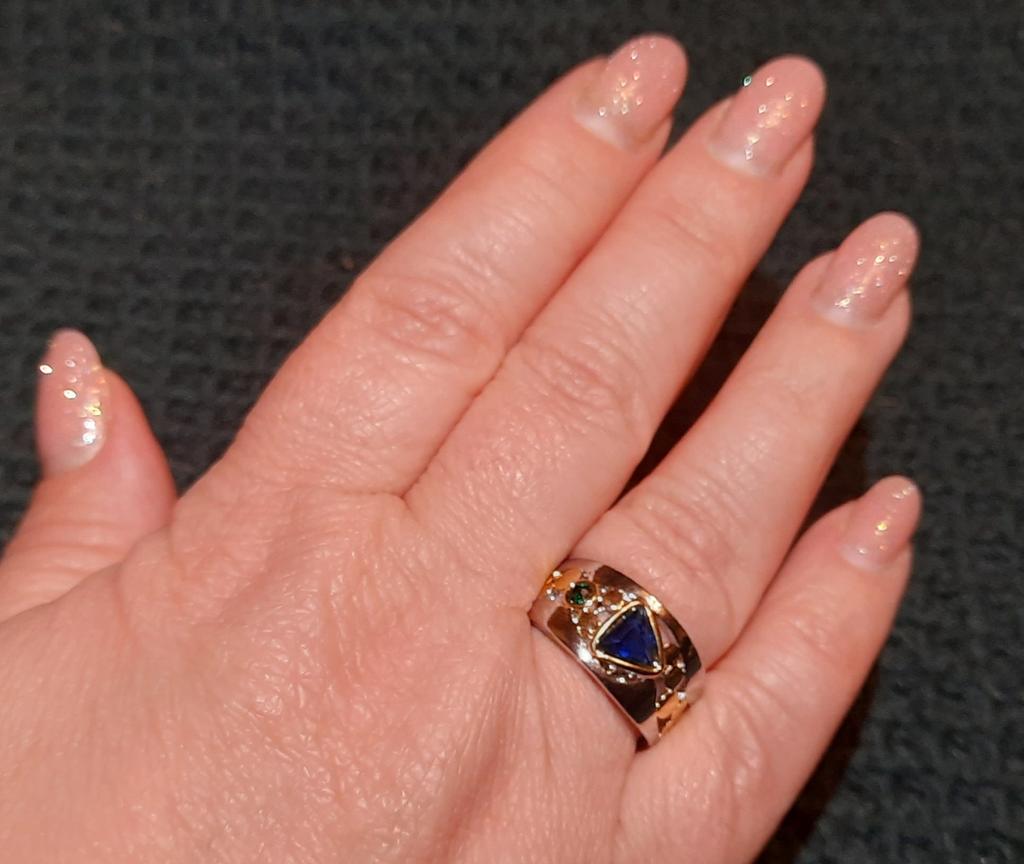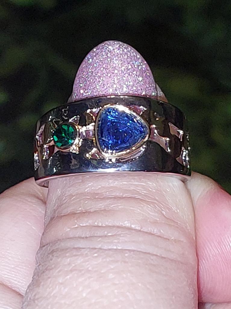 The ring is interesting - a combination of white and yellow metals, beautiful, bright green and blue stones...