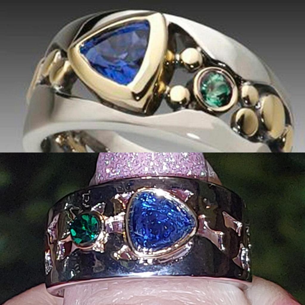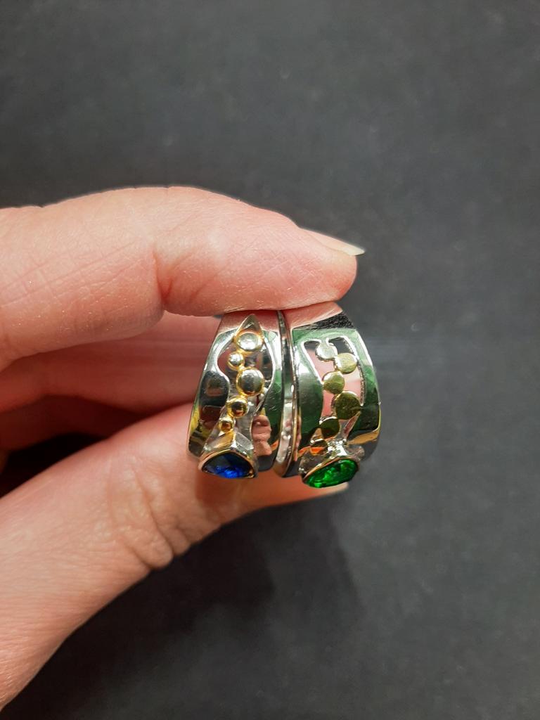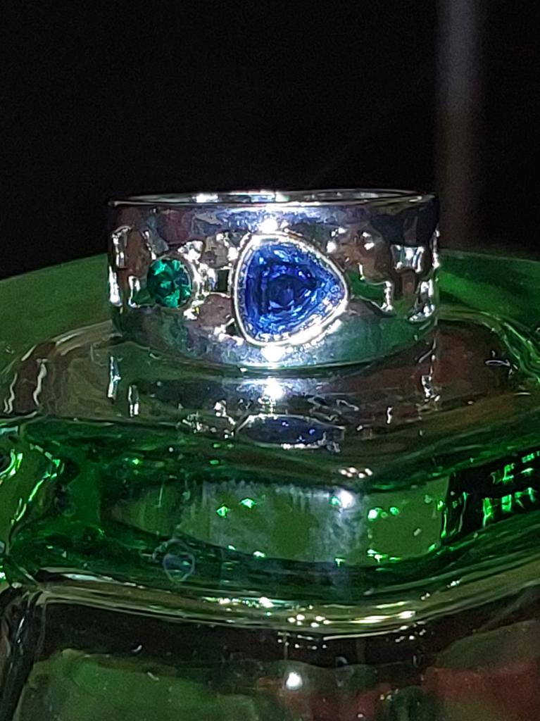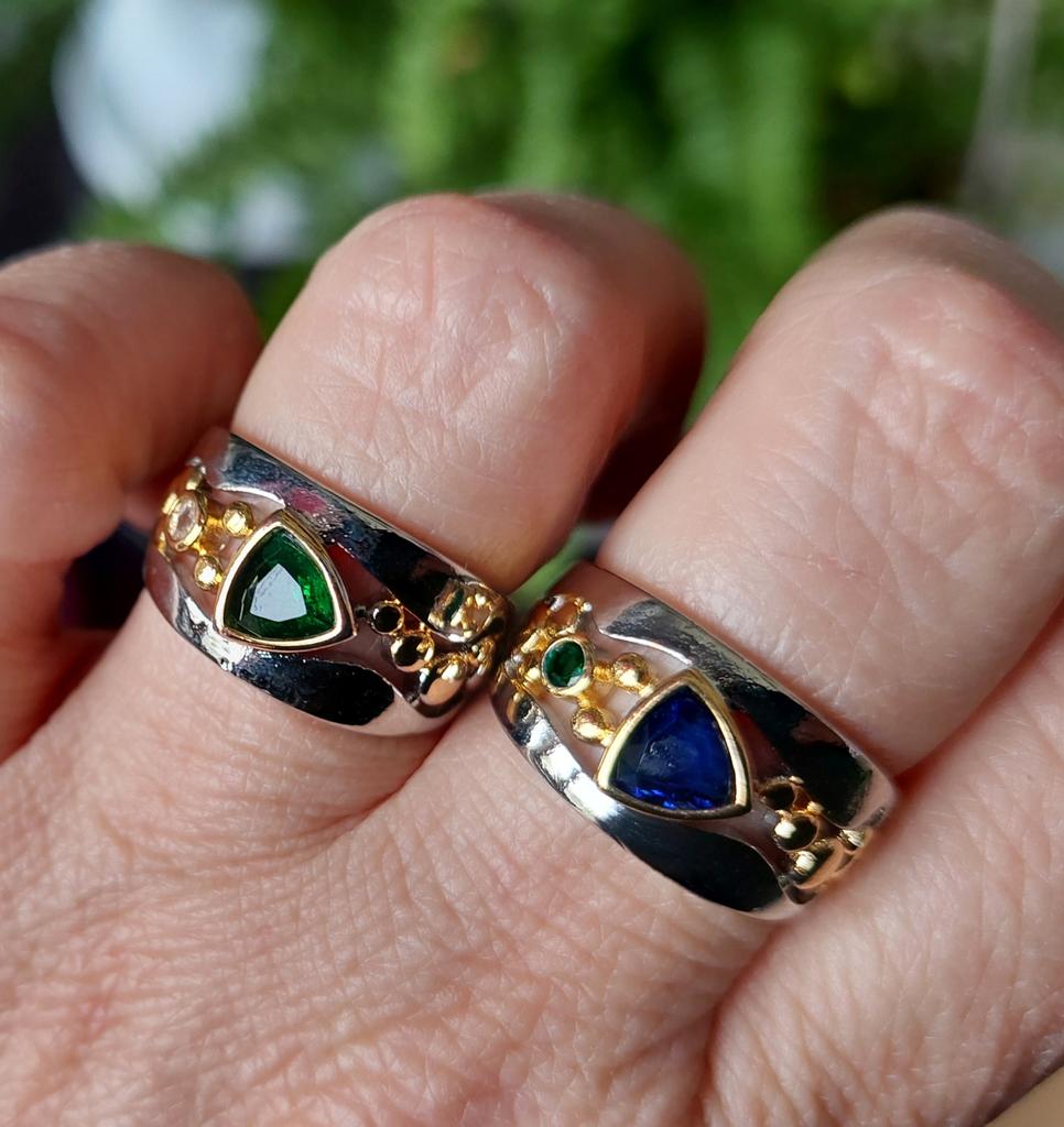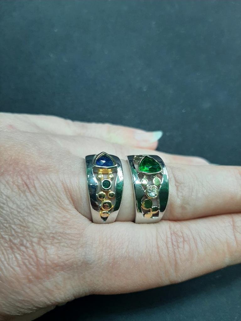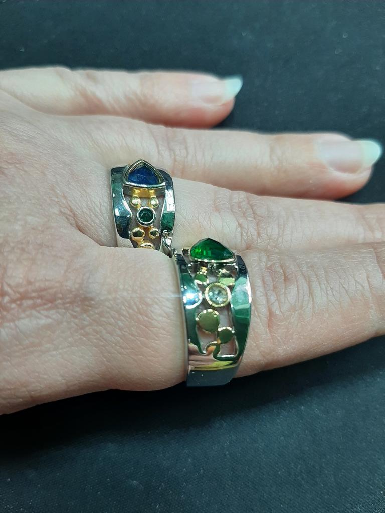 The ring is interesting - a combination of white and yellow metals, beautiful, bright green and blue stones...