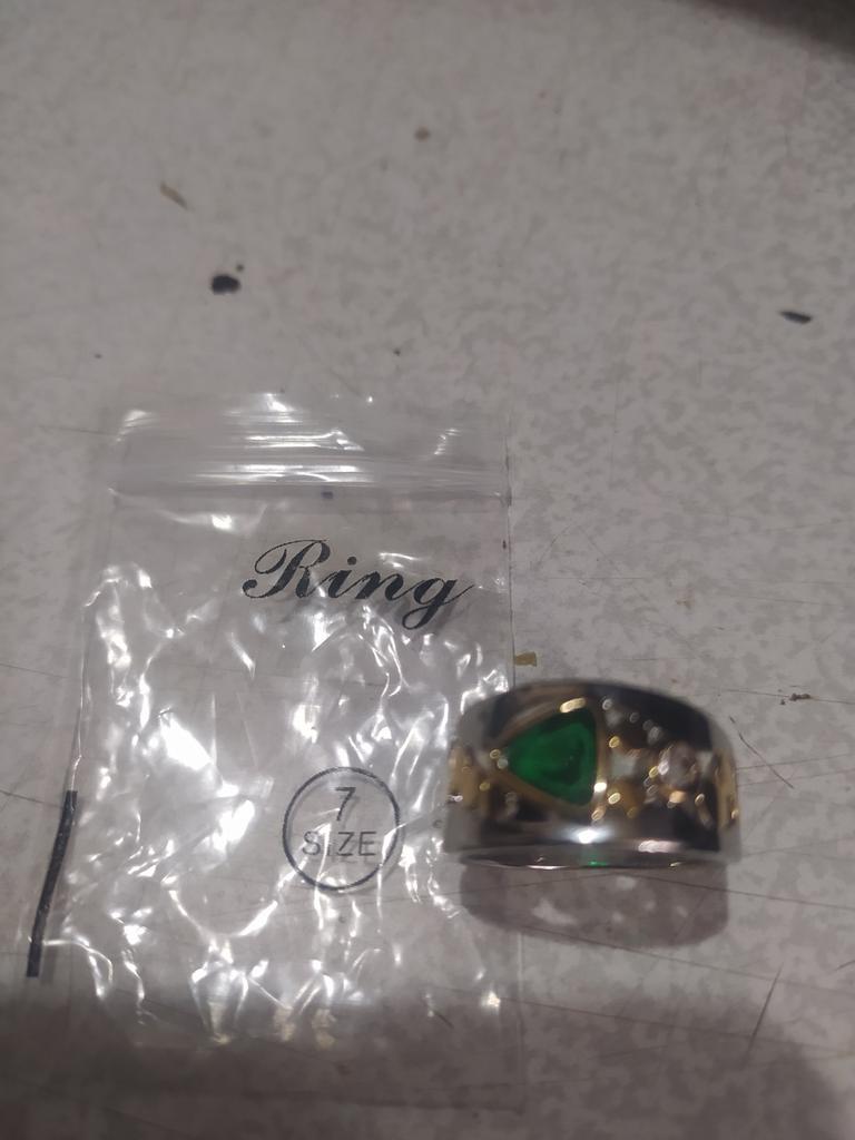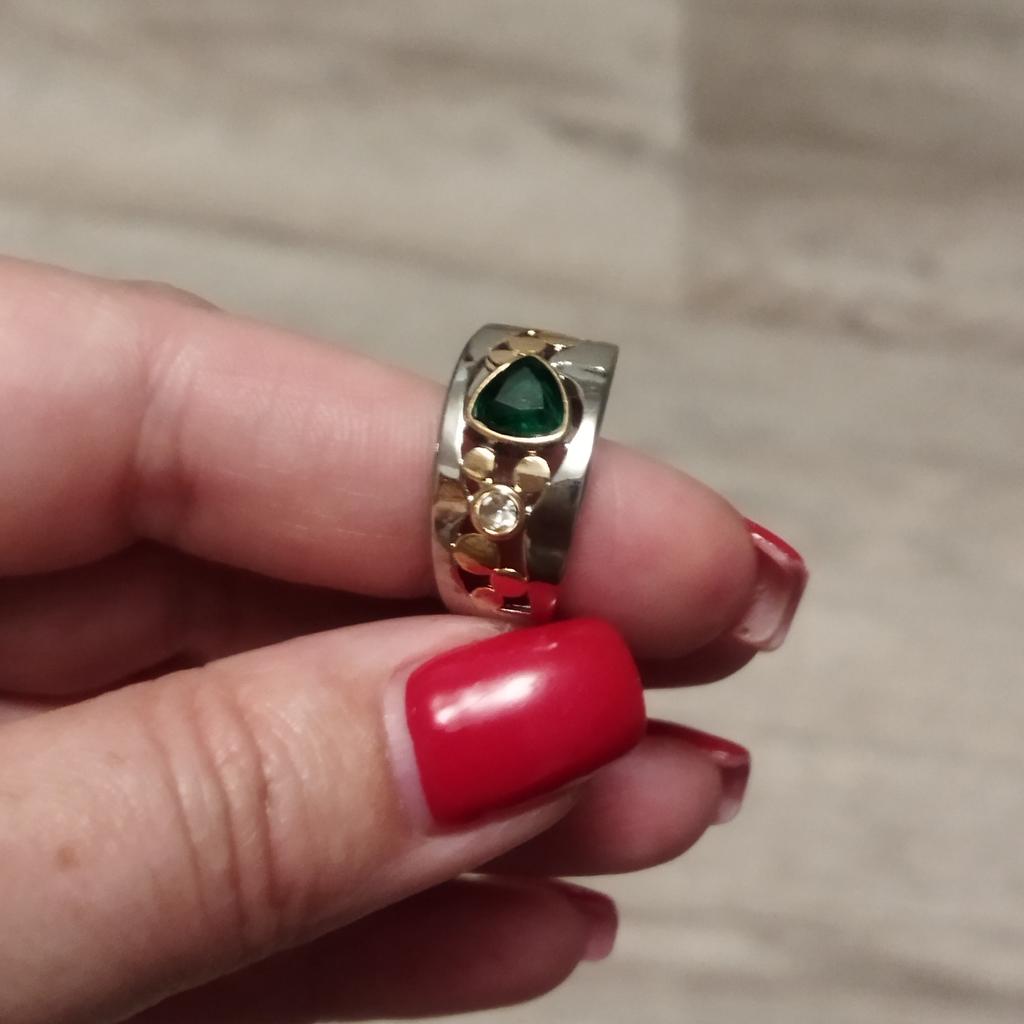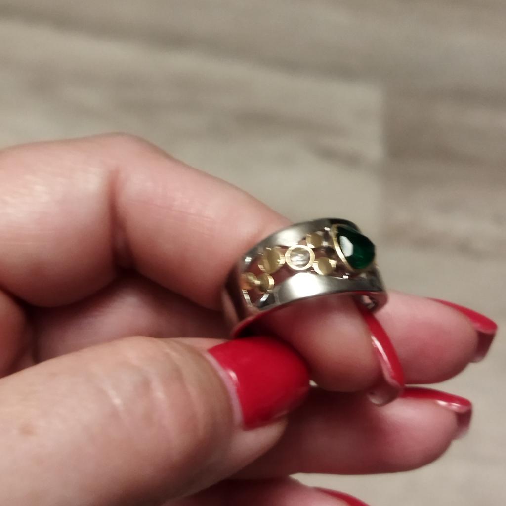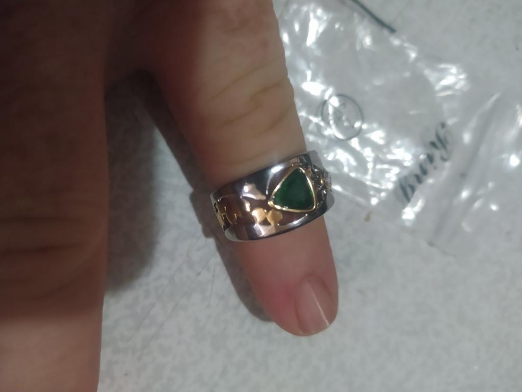 Doesn't quite match the photo, I don't know who writes 'like in the photo',,, the metal looks matte in the photo, but here it shines a lot and that makes it look very cheap,, it's clear that the price is minuscule,,, but I wouldn't have bought it if I had seen it in person,,, and the green stone is clearly visible in the photo, that's what attracted me,, but on the ring it's not visible at all, probably the diameter is 2 mm