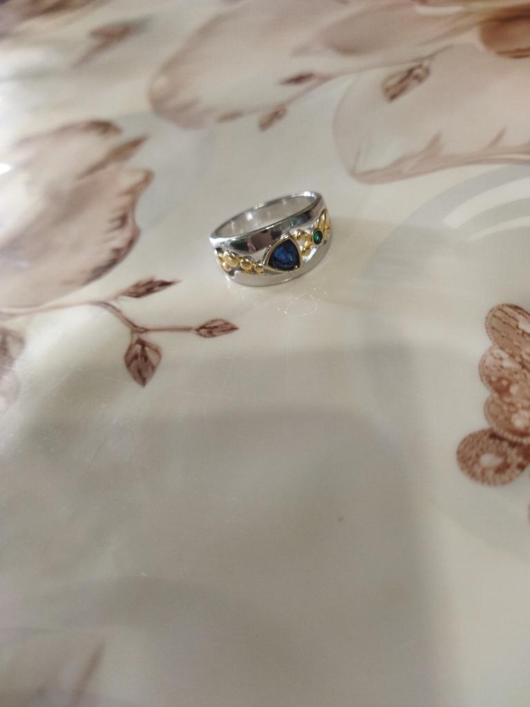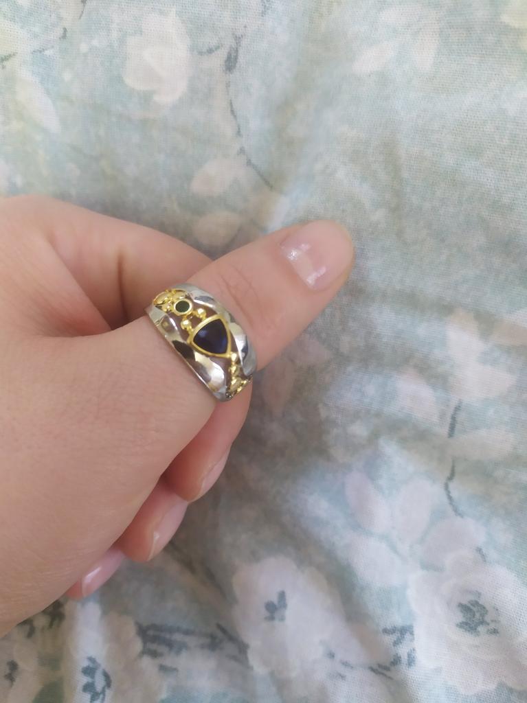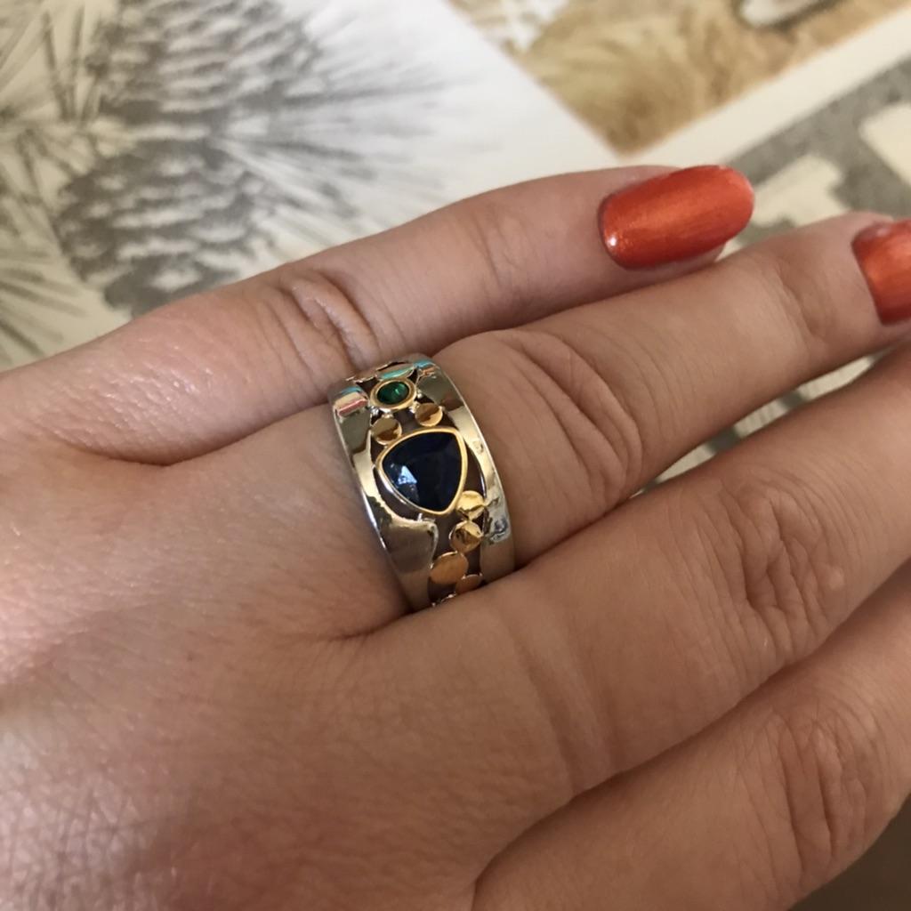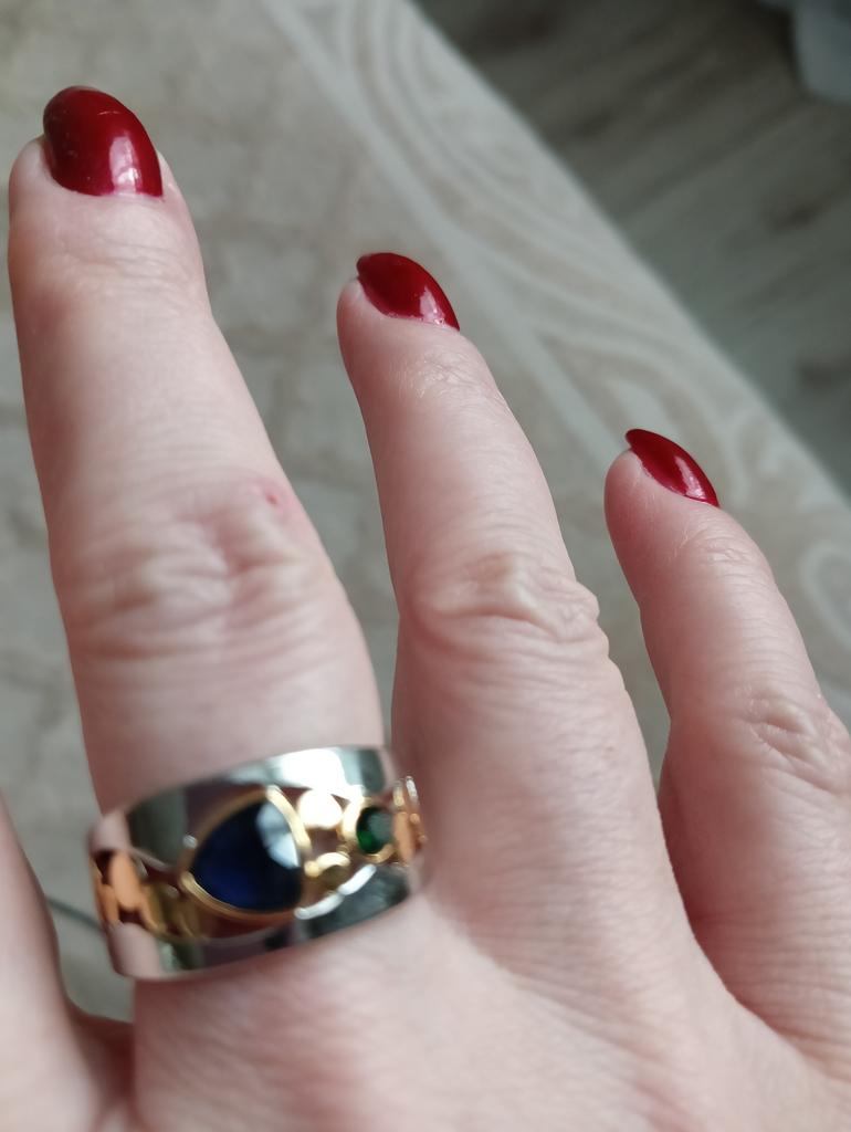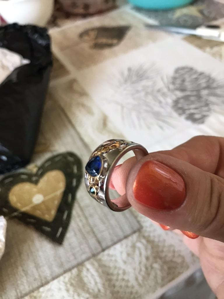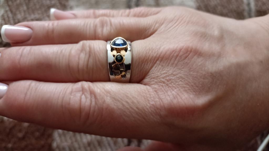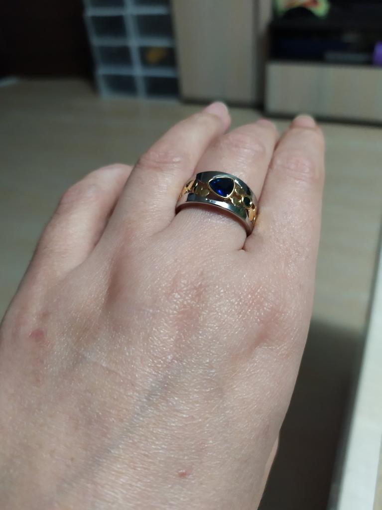 The ring looks rich, and the stone looks like a sapphire))) wide, gold on silver))), I recommend