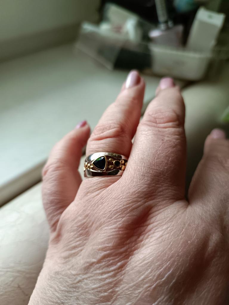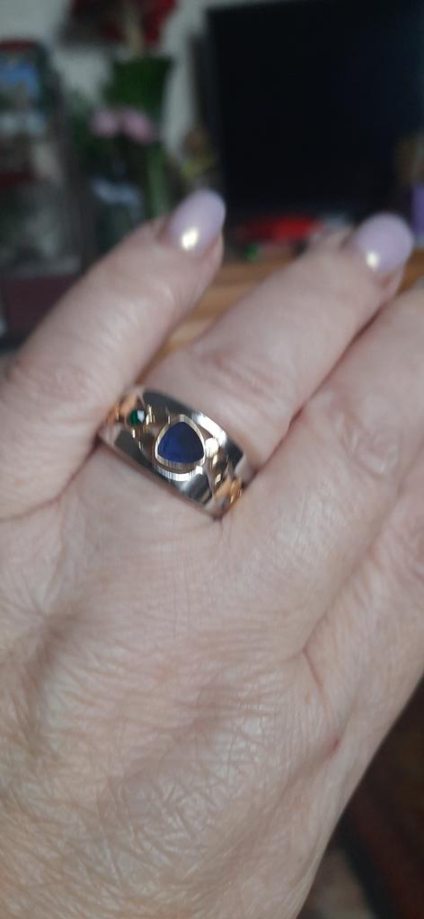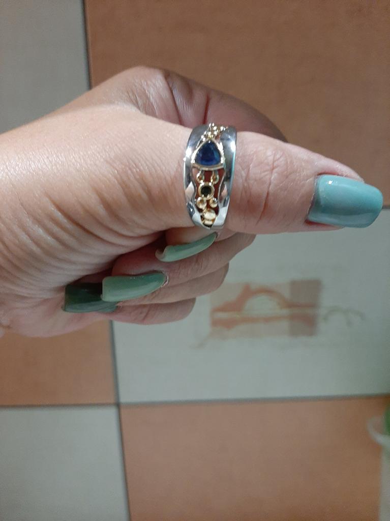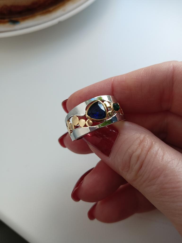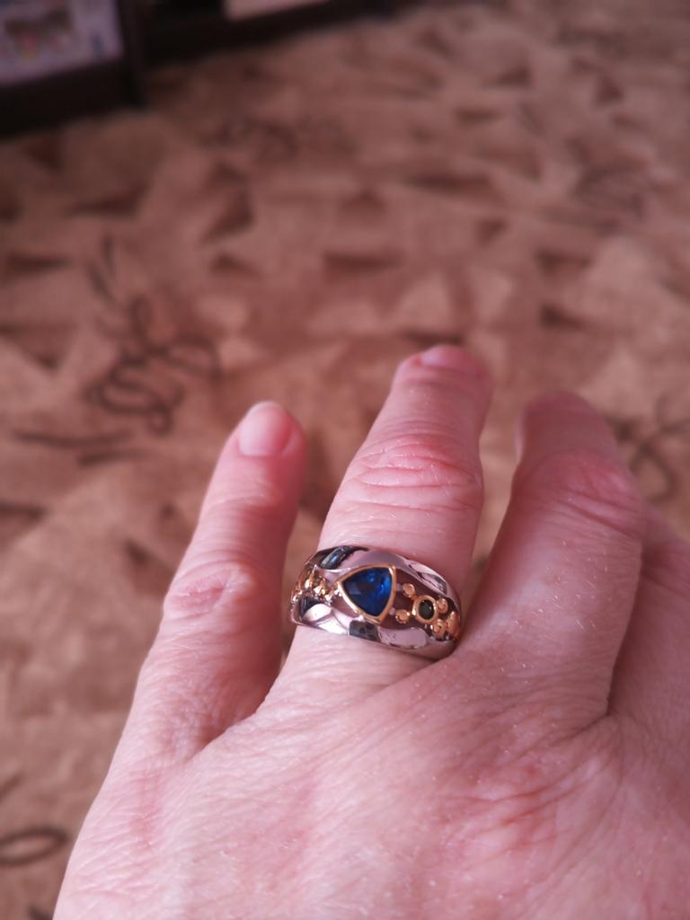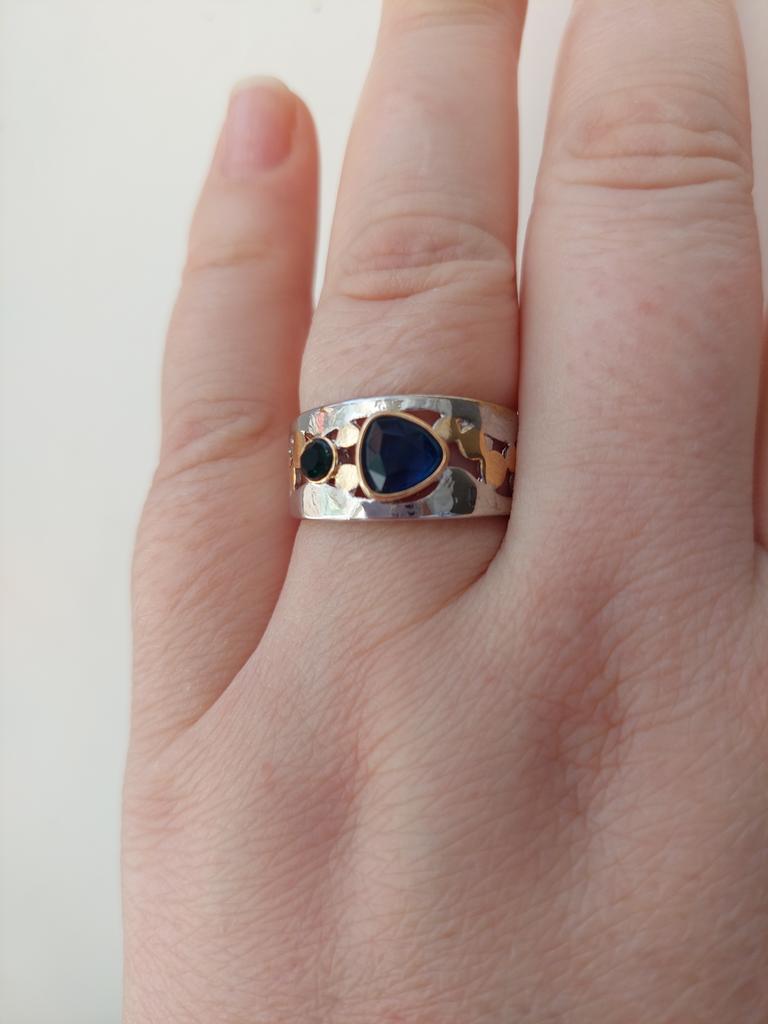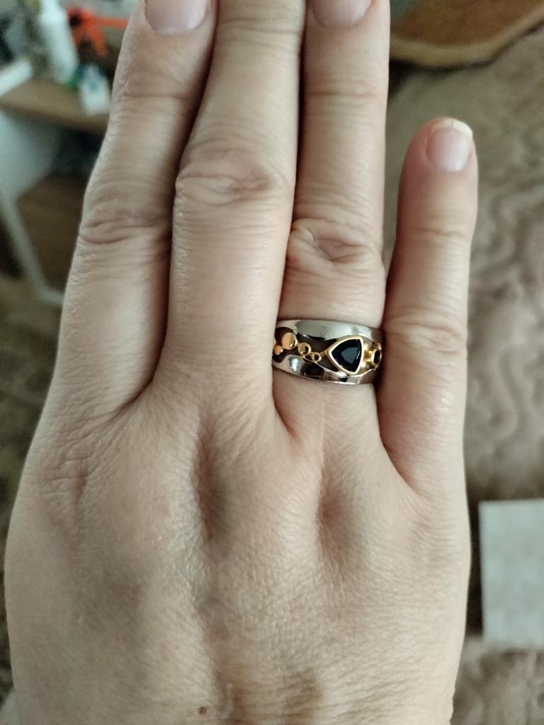 The ring looks rich, and the stone looks like a sapphire))) wide, gold on silver))), I recommend