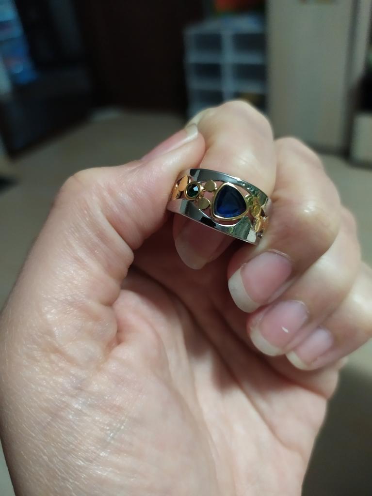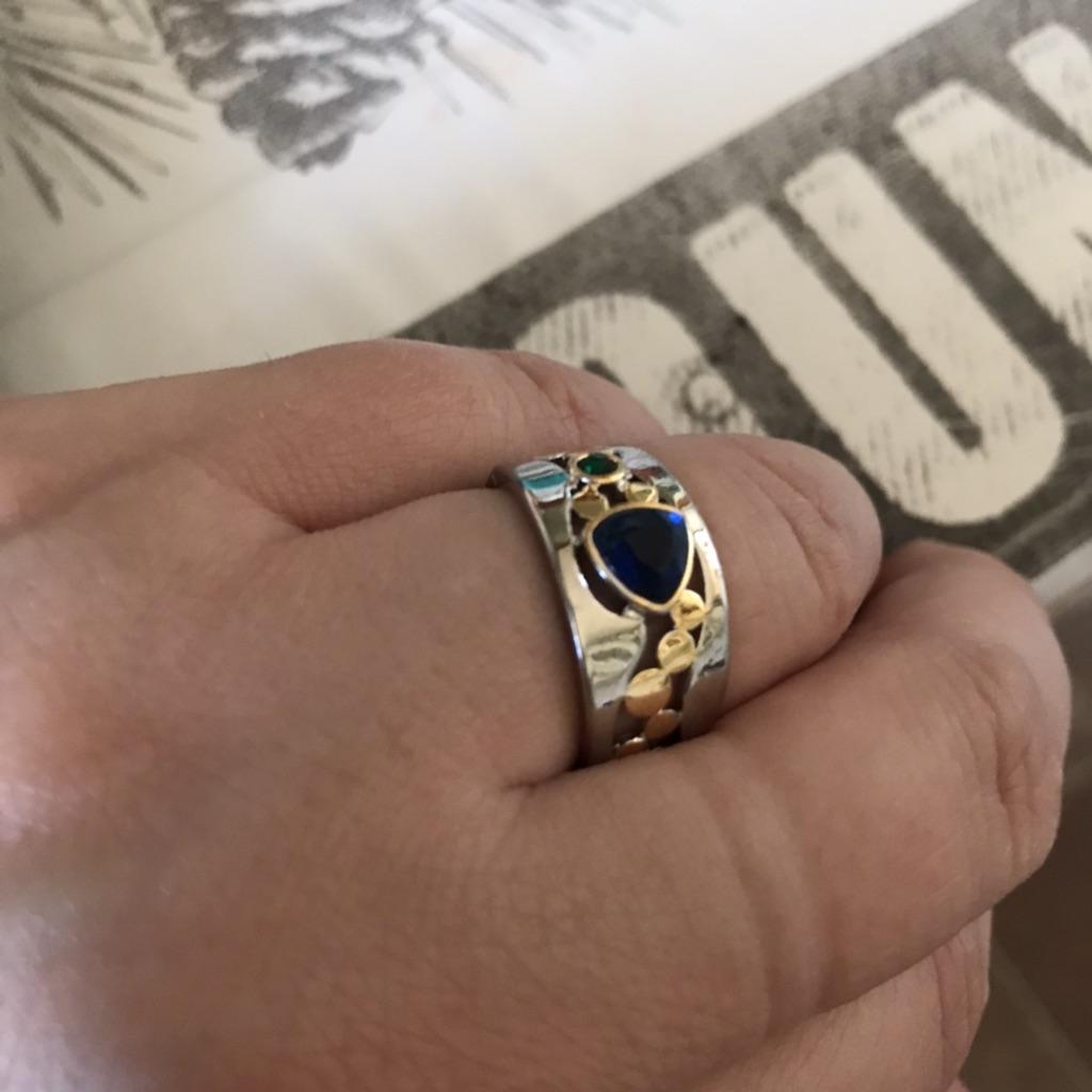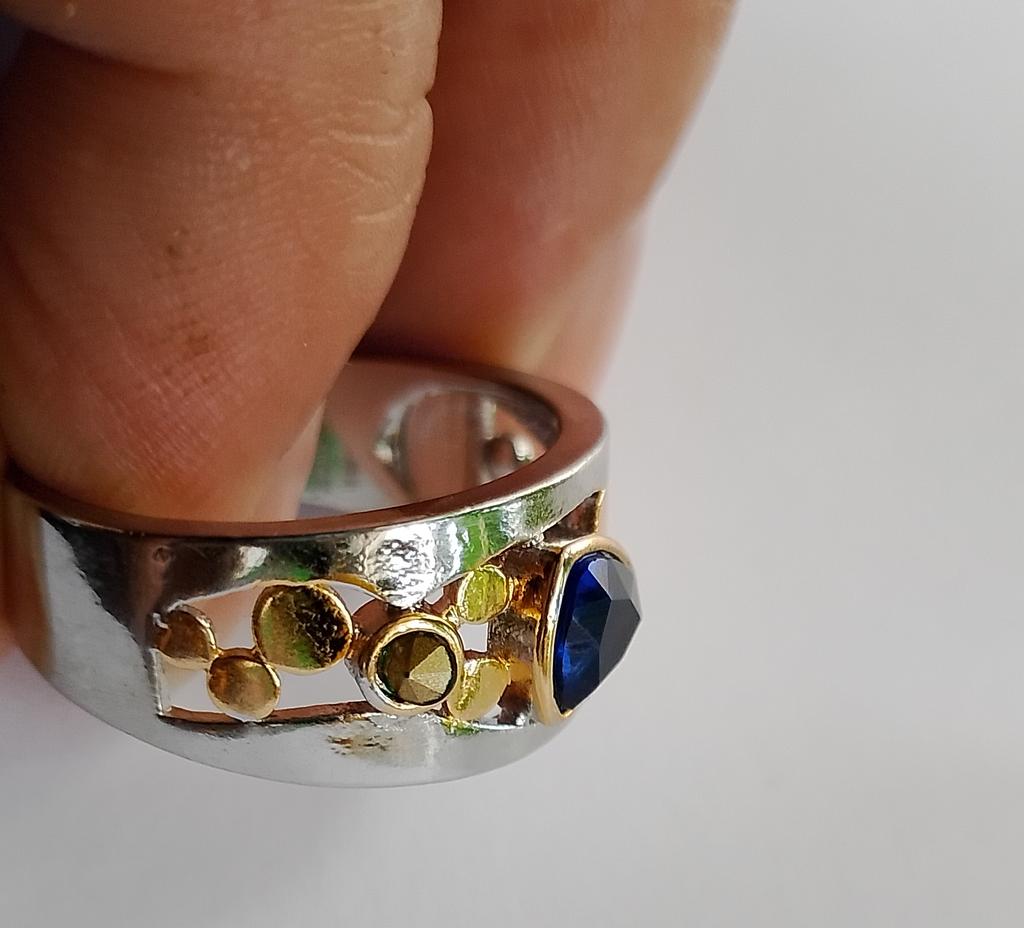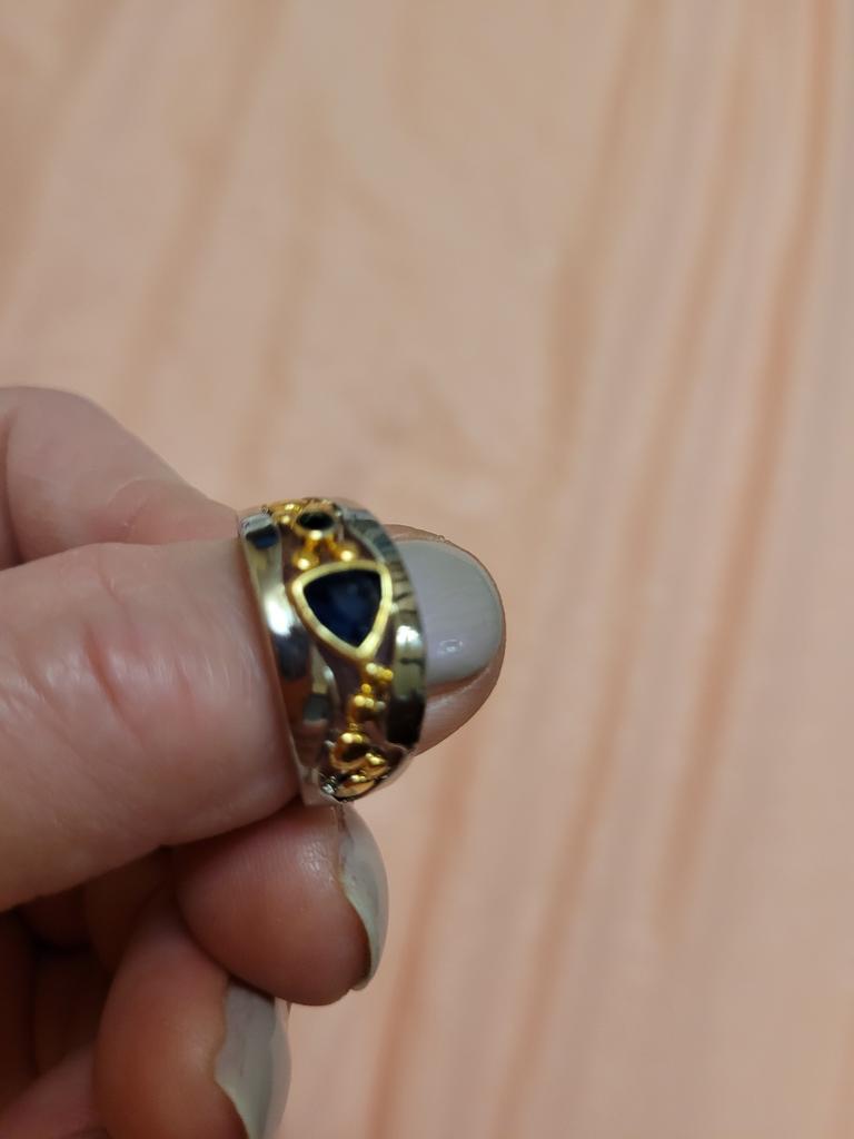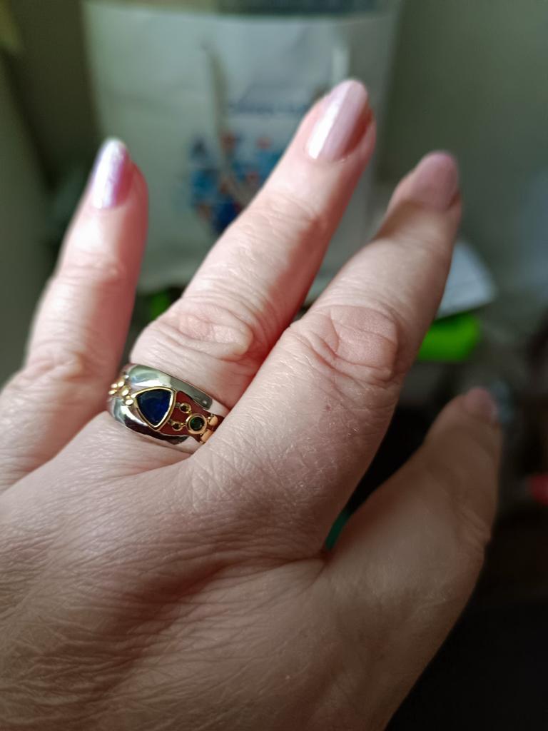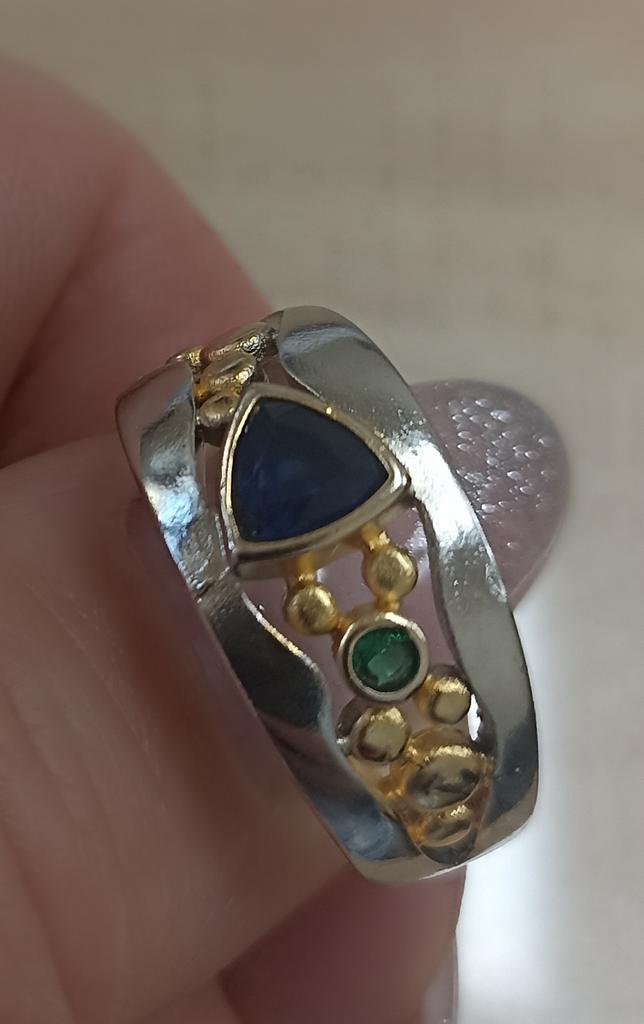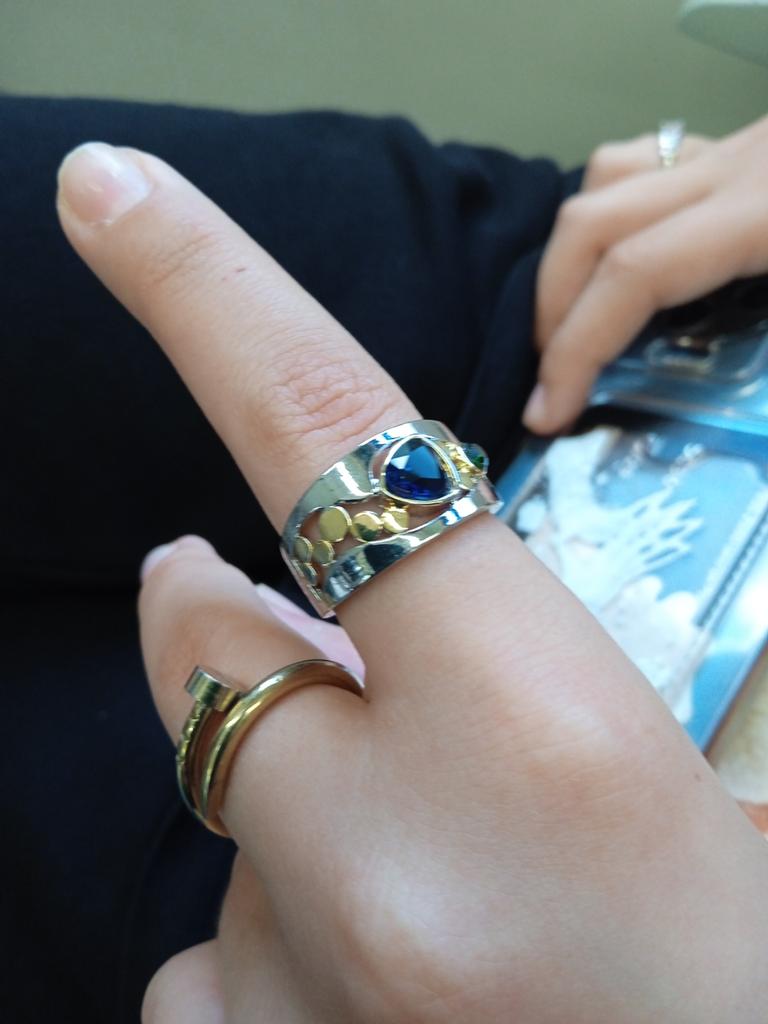 The ring looks rich, and the stone looks like a sapphire))) wide, gold on silver))), I recommend