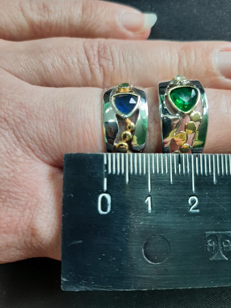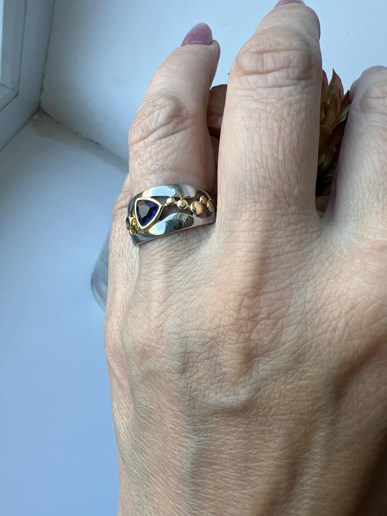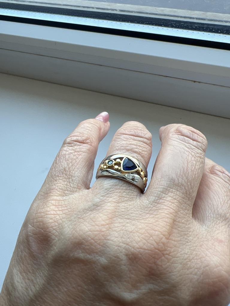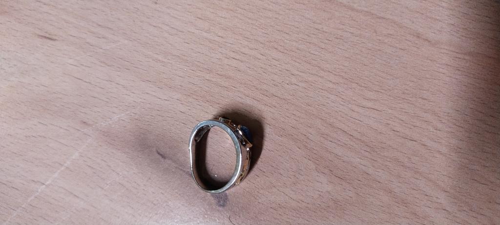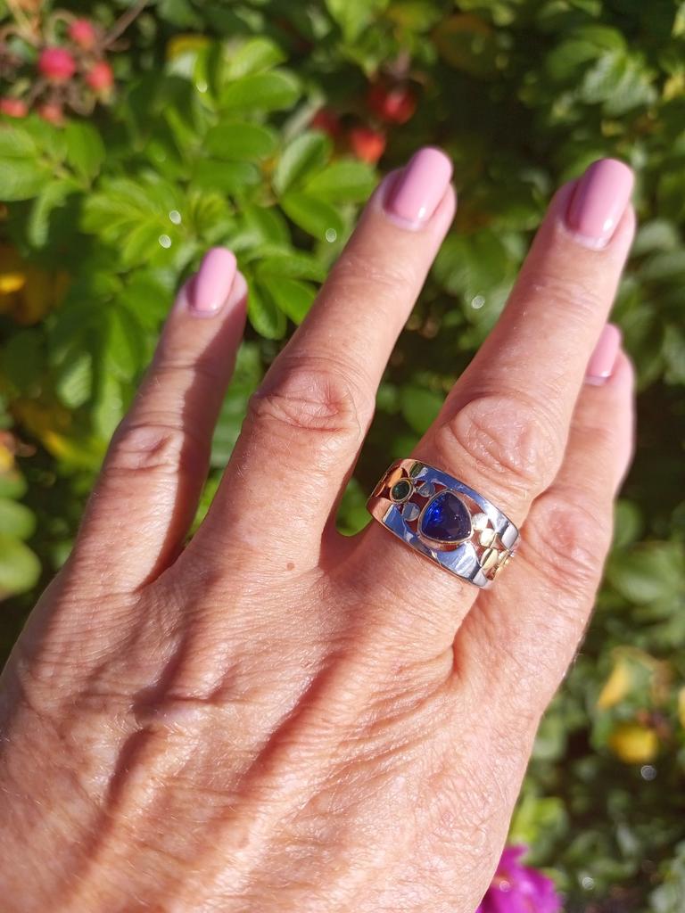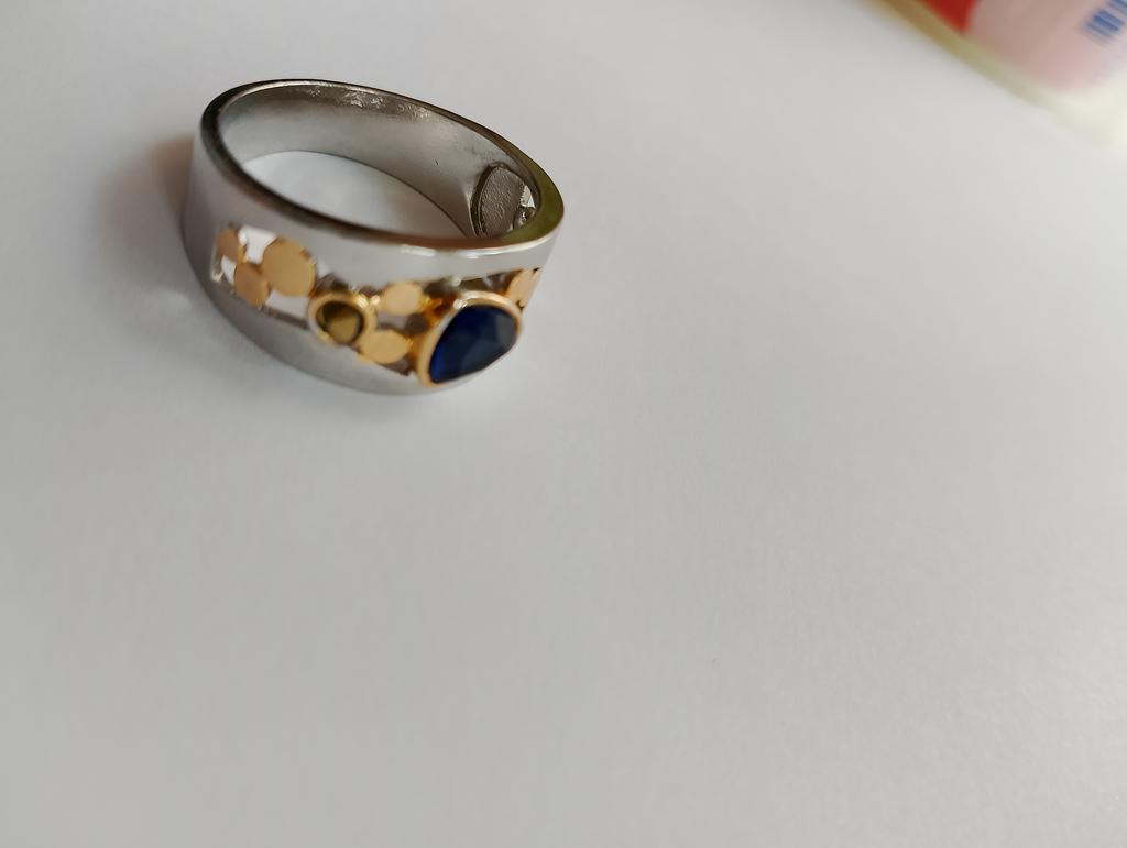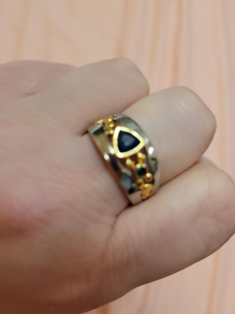 The ring looks rich, and the stone looks like a sapphire))) wide, gold on silver))), I recommend