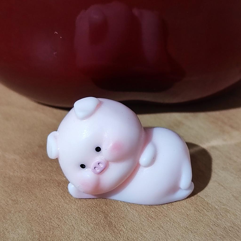 Miniature lucky pig ๐ I ordered this little decorative pig to decorate a shelf. Due to its small size, it is ideal to place anywhere, even to decorate the inside of a pot.. There are various designs of little pigs but I asked for the lying pig because for me it is the funniest. The little pigs are made of plastic, very well painted and with an excellent finish, I liked it a lot.