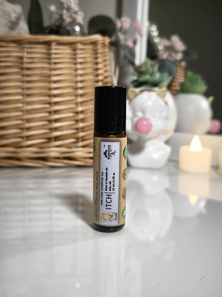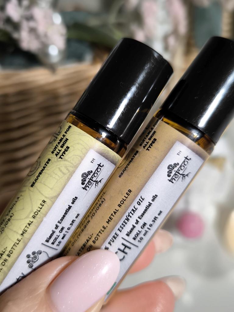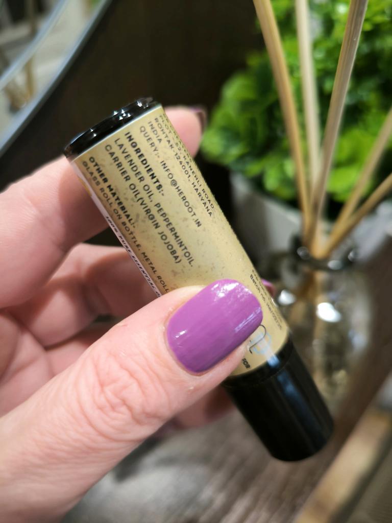 Heroot Essential Oil Blend Roll-On is a ready-to-use aromatherapy roll-on formulated with lavender and peppermint essential oils, blended with a carrier oil for smooth topical application.