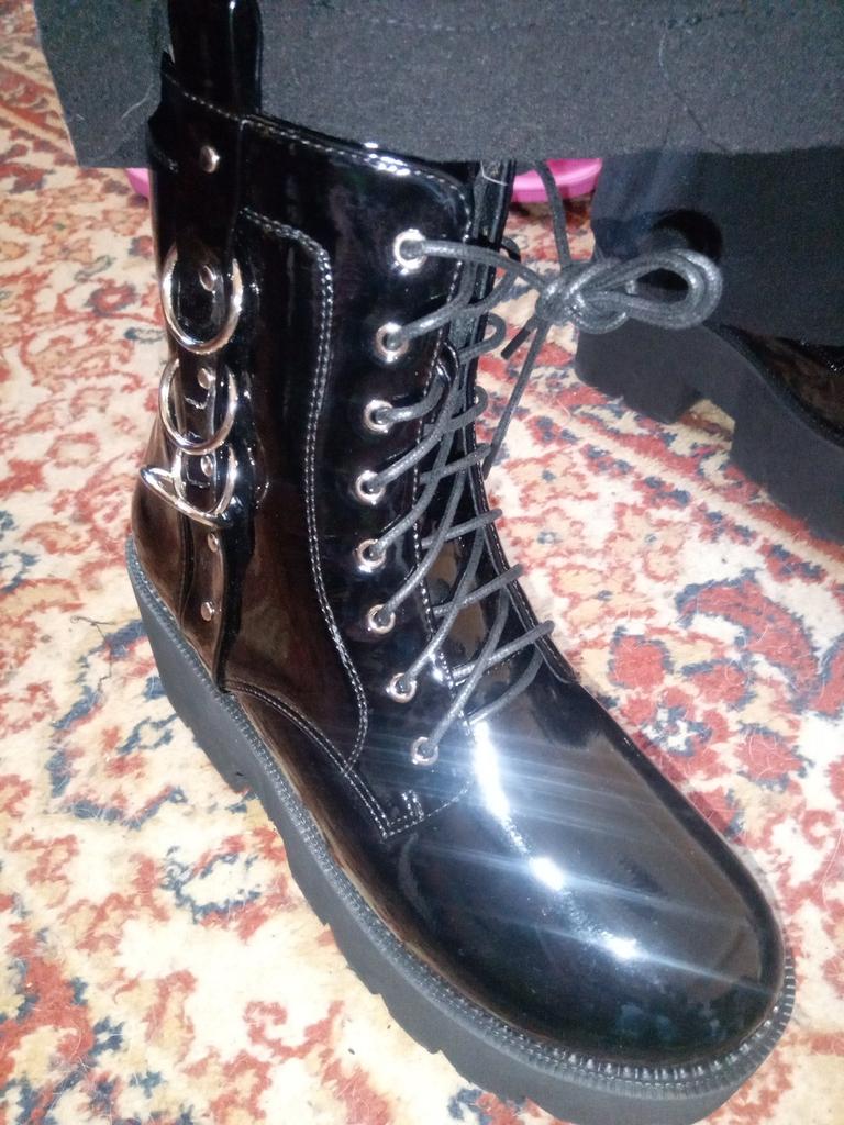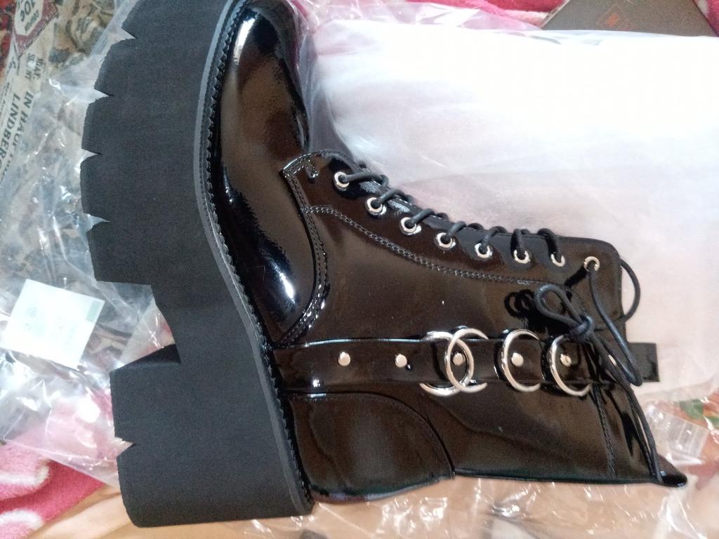 Gdgydh Sexy Belt Buckle Women Platform Combat Boots Pantent Leather Autumn Winter Lace Up Goth Booties Chunky Heel Dark Blackness