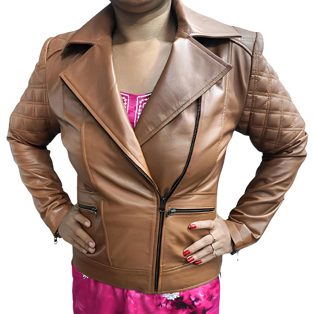 NOORA Womens Brick Tan Colour Jacket | Cross Quilted Leather Jacket With Pocket & Multi Zip | Stylish Fashion Jacket | Biker Jacket | Western Style .
