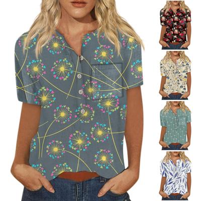 Women's Loose Casual Short Sleeved Lapel Button Digital Print With Pocket Shirt Top