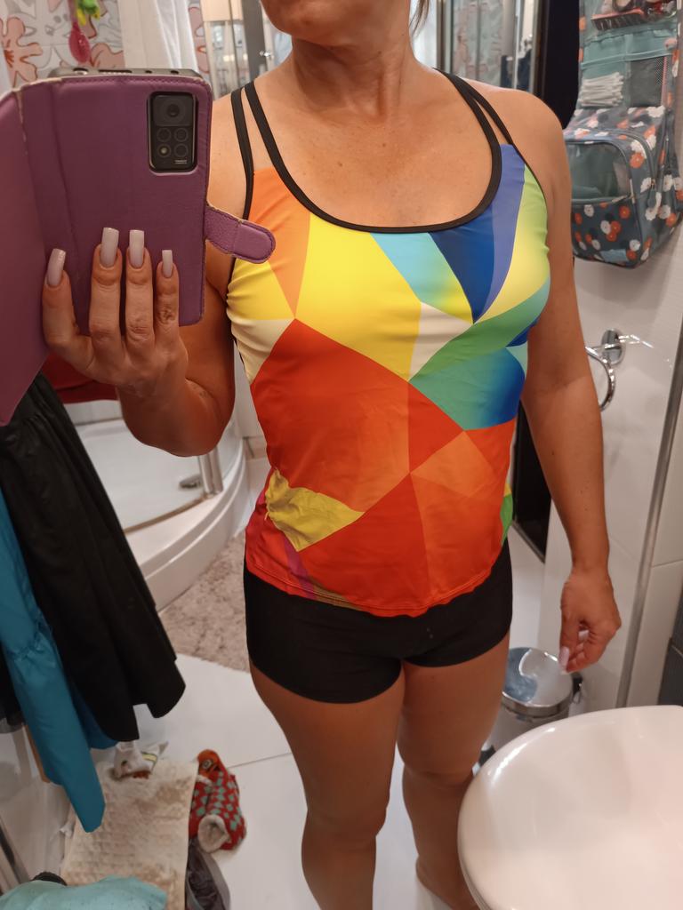 The tank top is too tight for me because it is fitted, i.e. designed for a slim waist. This is a minus. My size is 48-50, I ordered XL.