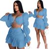 Women Skirts Set Solid Bandage Puff Sleeve Crop Tops Mini Skirt Two 2 Piece Sets Sexy Night Clubwear Fashion Outfit Fall