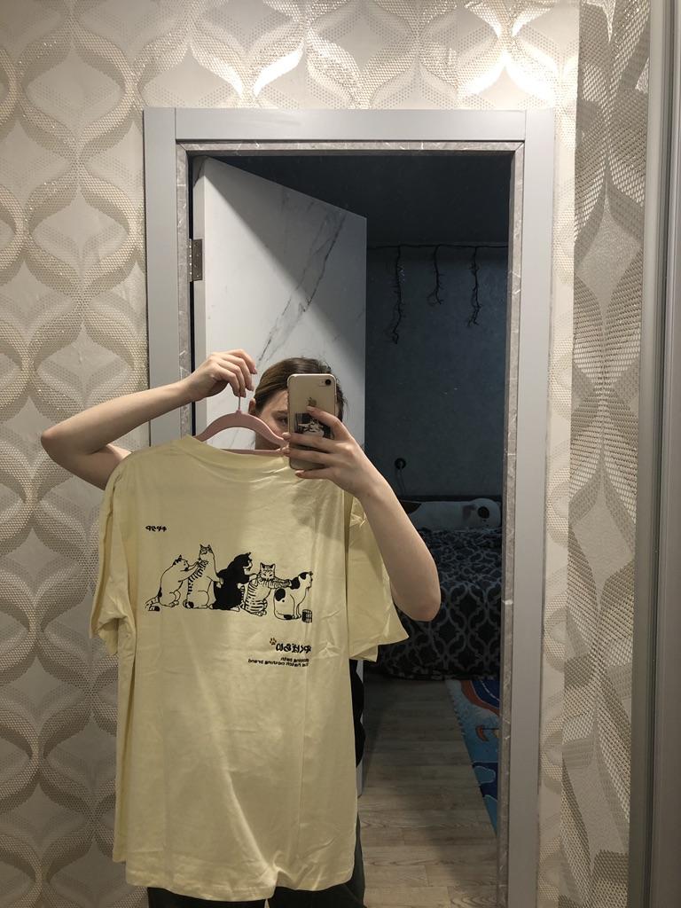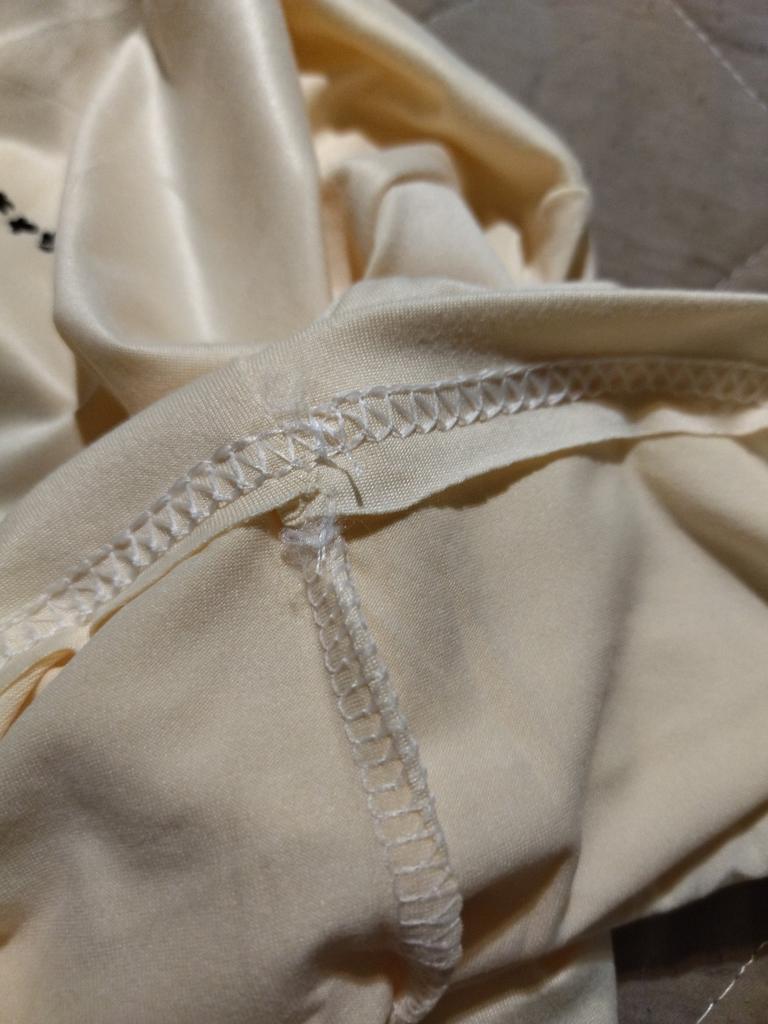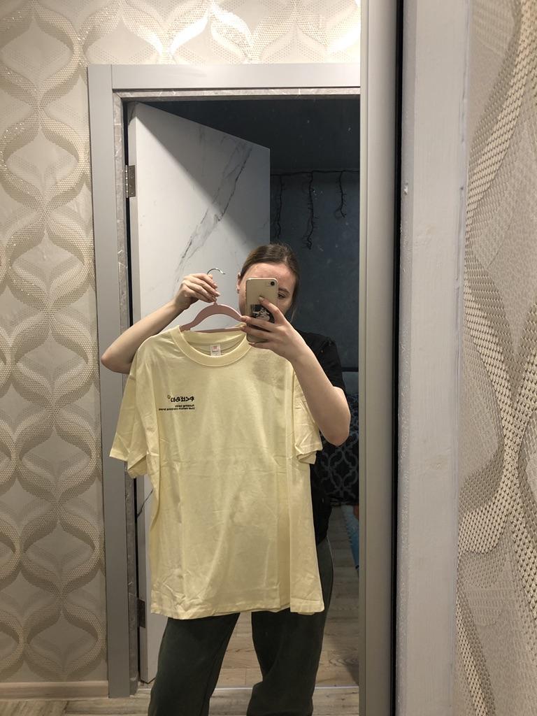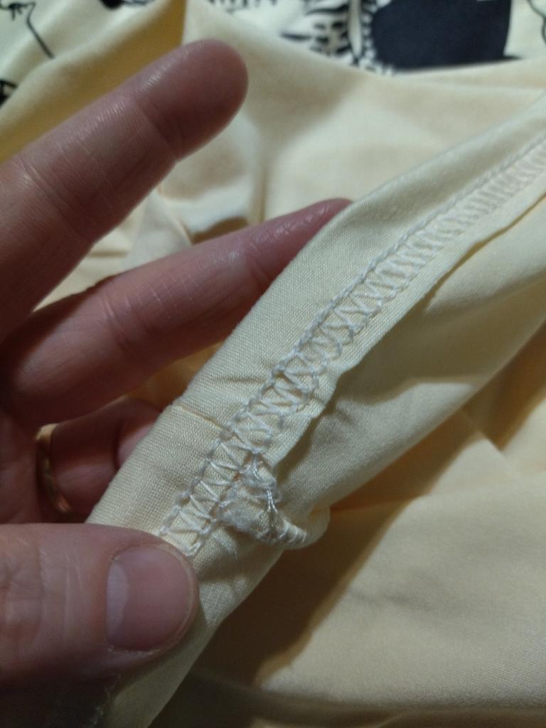 Sewn crookedly, the neck is wide to the sides, the color is not apricot, but pale yellow, there are no questions about the print - the print is cool