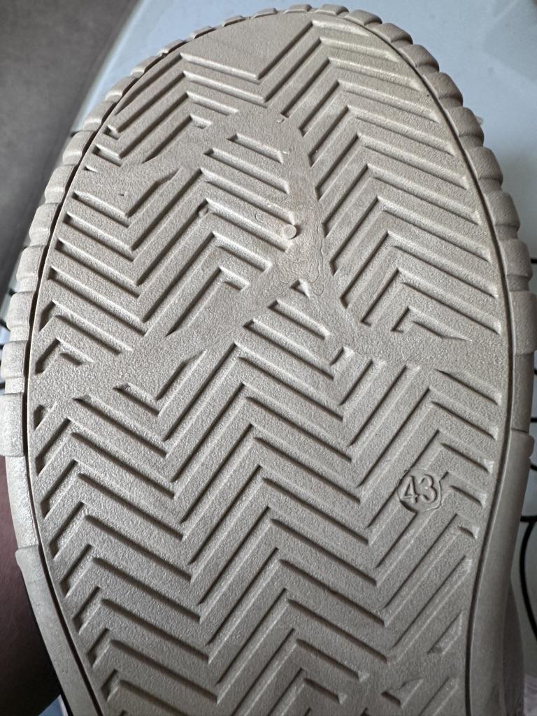 43 fits 26.5 cm (41) The sole resembles rubber. The upper is raincoat. Nothing special.
