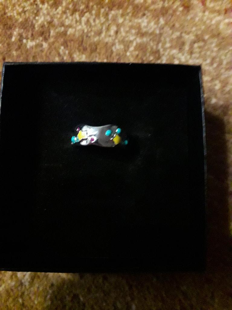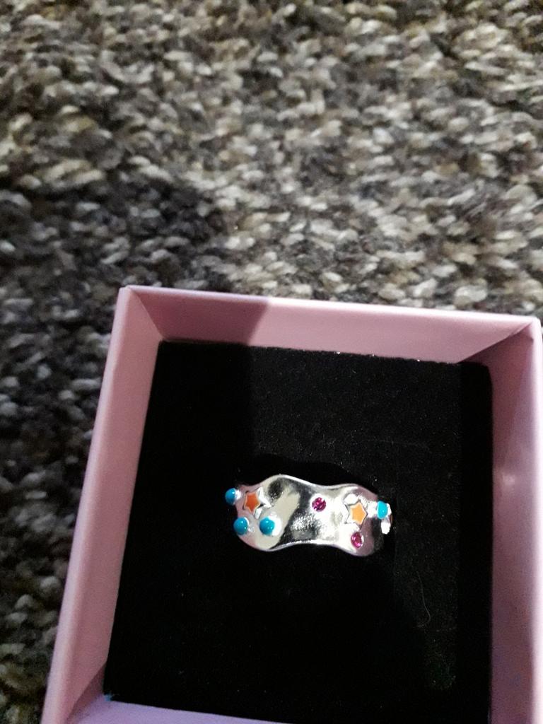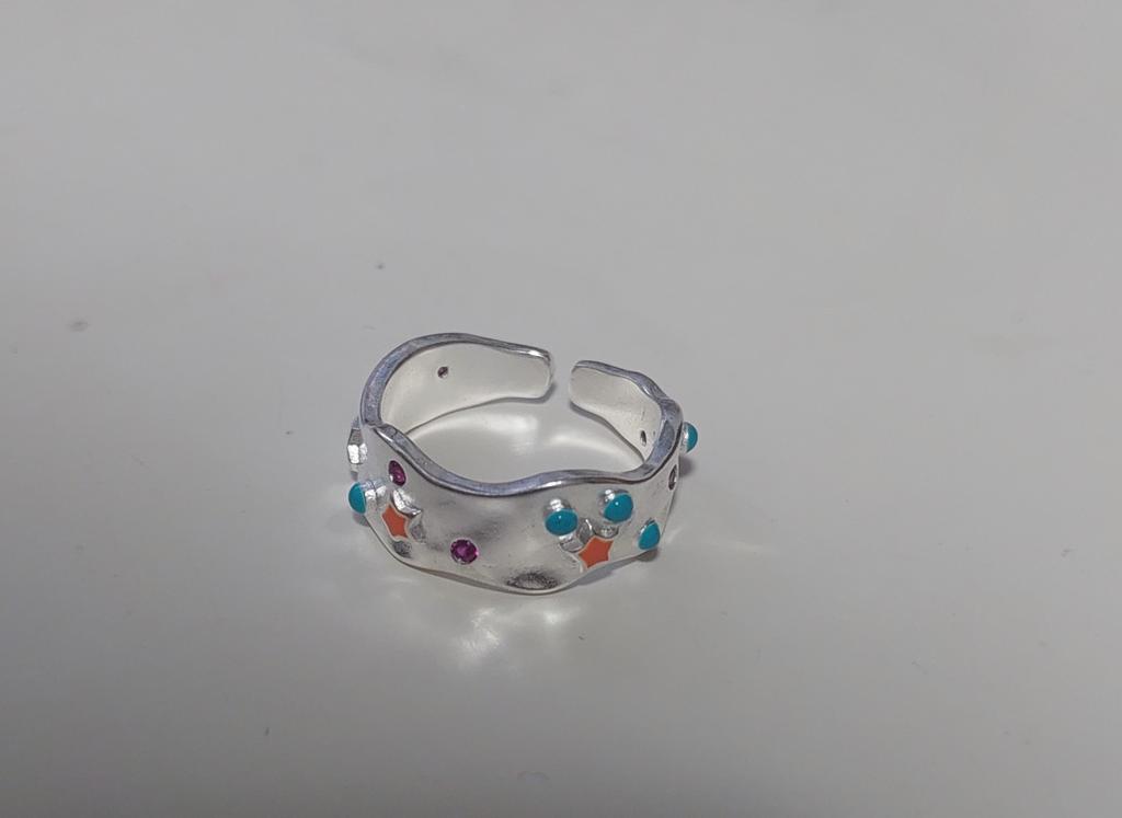 Open silver ring, decorated with glaze. Cute. I recommend for purchase.