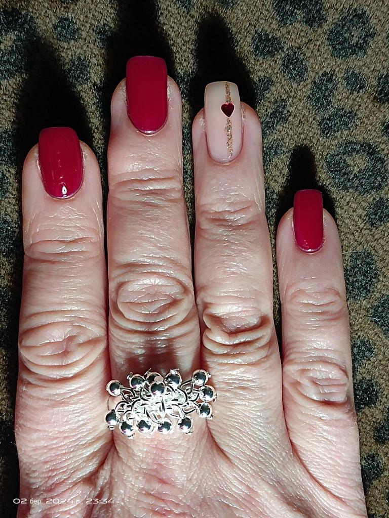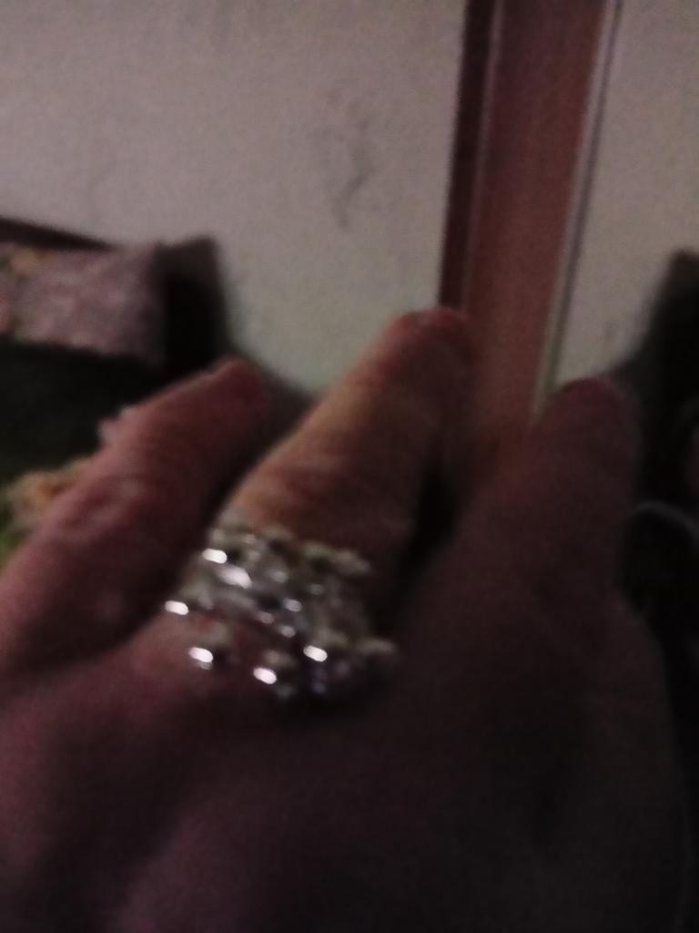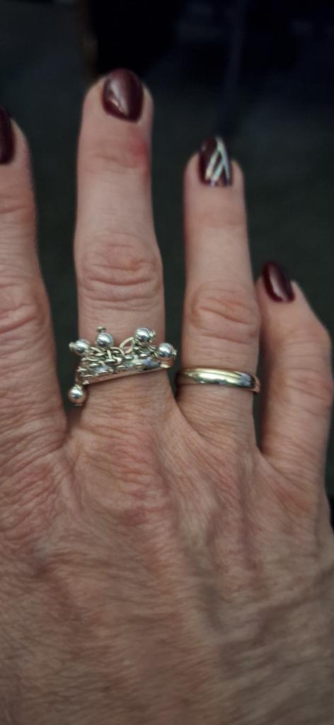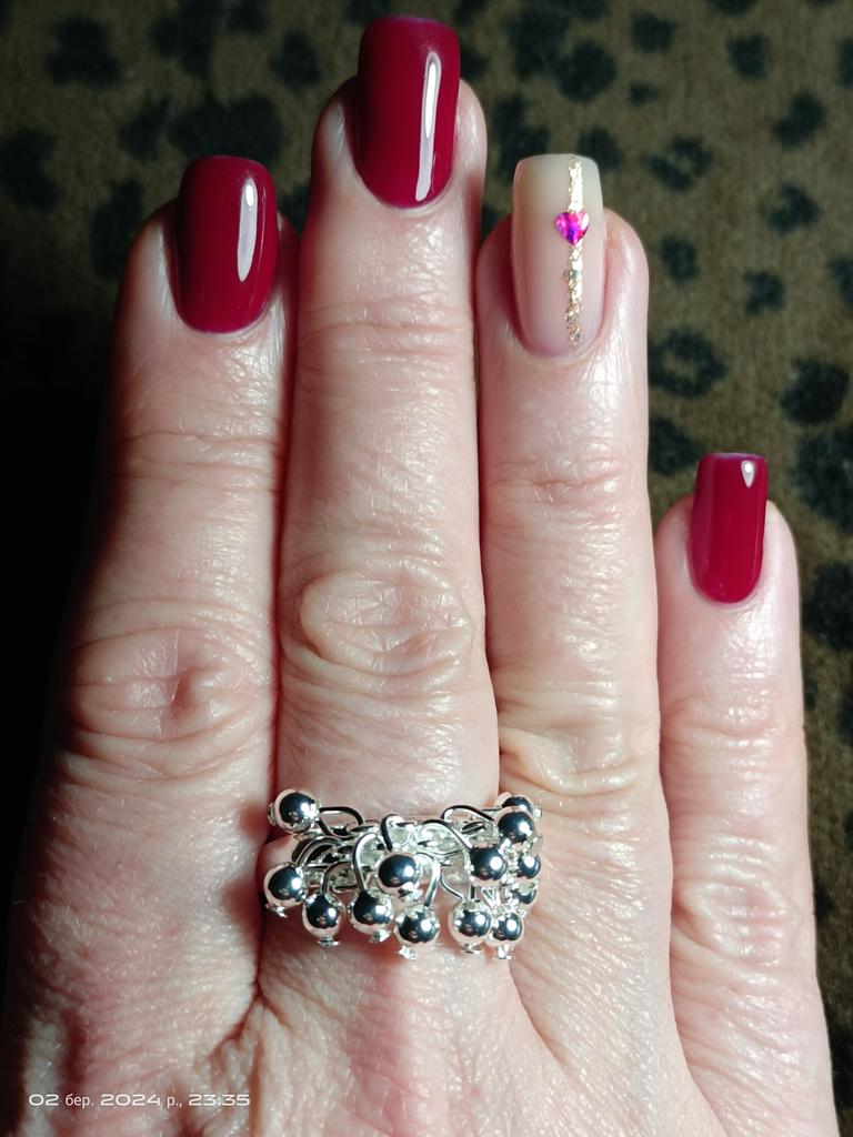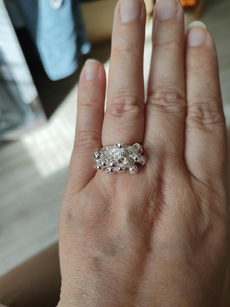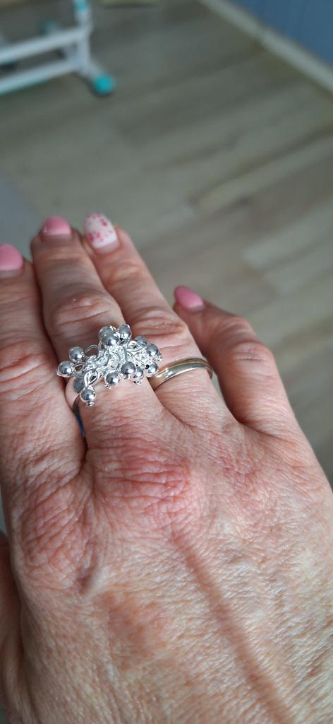 Beautiful jewelry that looks like white silver. An interesting ring, the beads are not fixed, they move in different directions. I took it as a set for a bracelet. I really liked it, I recommend it.