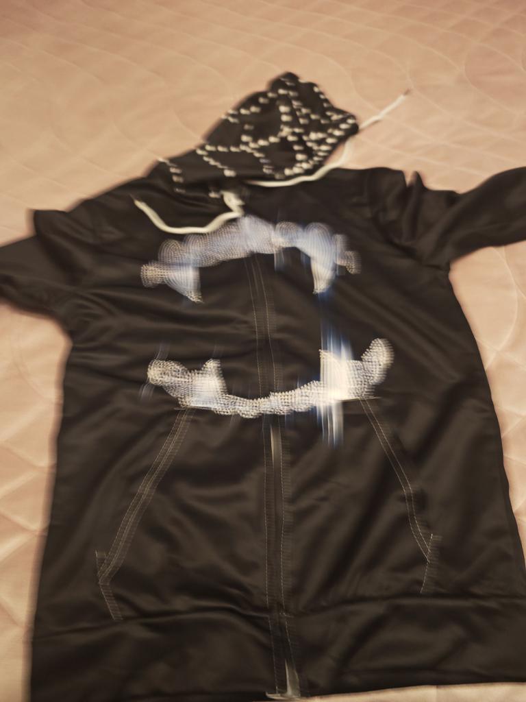 Just a blue picture printed on thin plastic, the dots on top look very ugly. On camera it's okay, but in real life it's all blue and low quality. The hood doesn't look like in the picture, it just has huge dots without the web pattern.