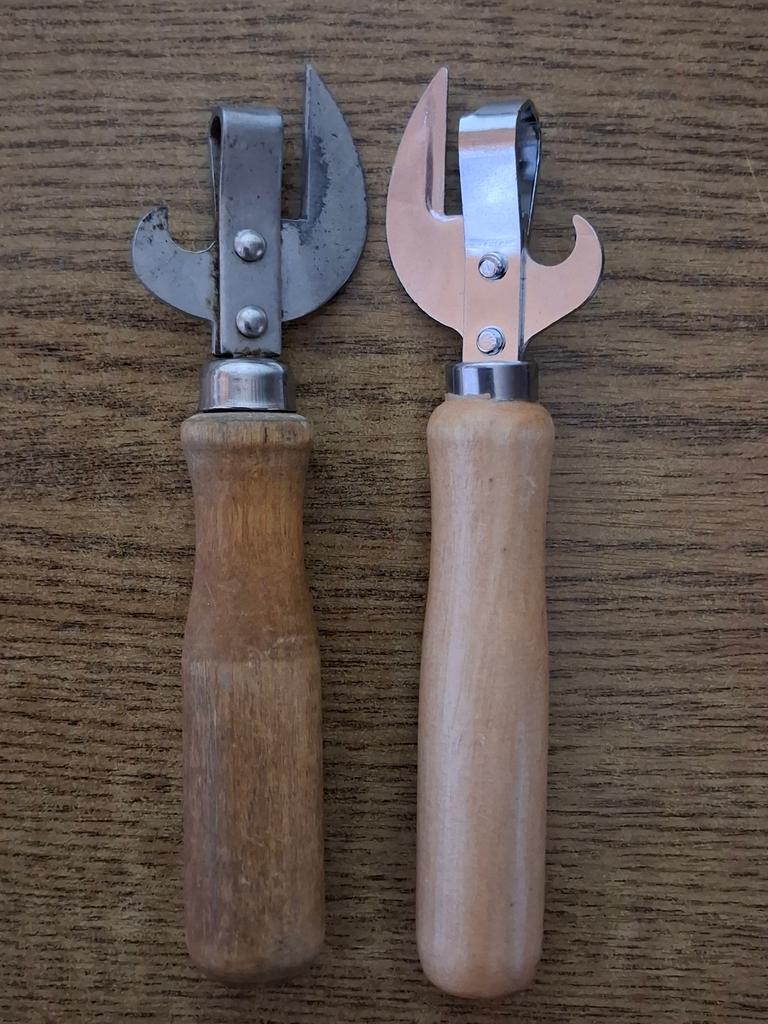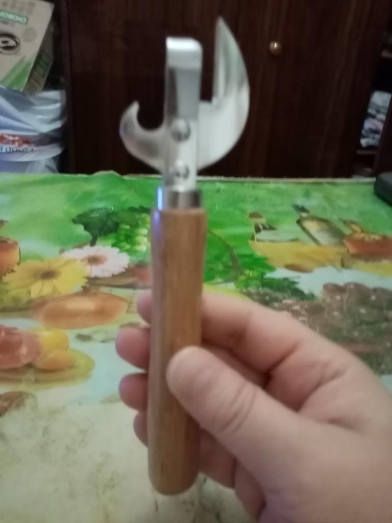 Excellent can opener with a wooden handle, very comfortable, easily opens canned goods and metal lids on jars.