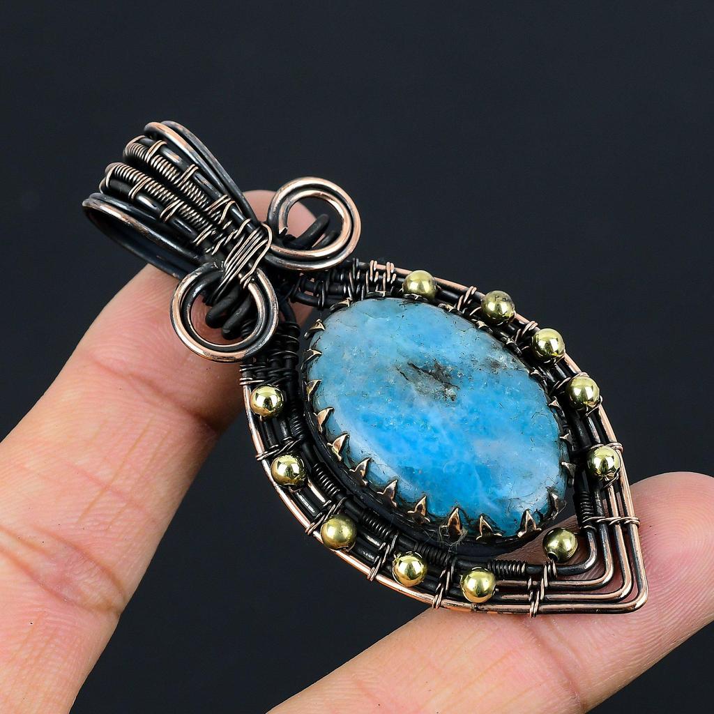 Neon Blue Apatite Gemstone Pure Copper Wire Wrapped Handmade Pendant Jewelry For Gift