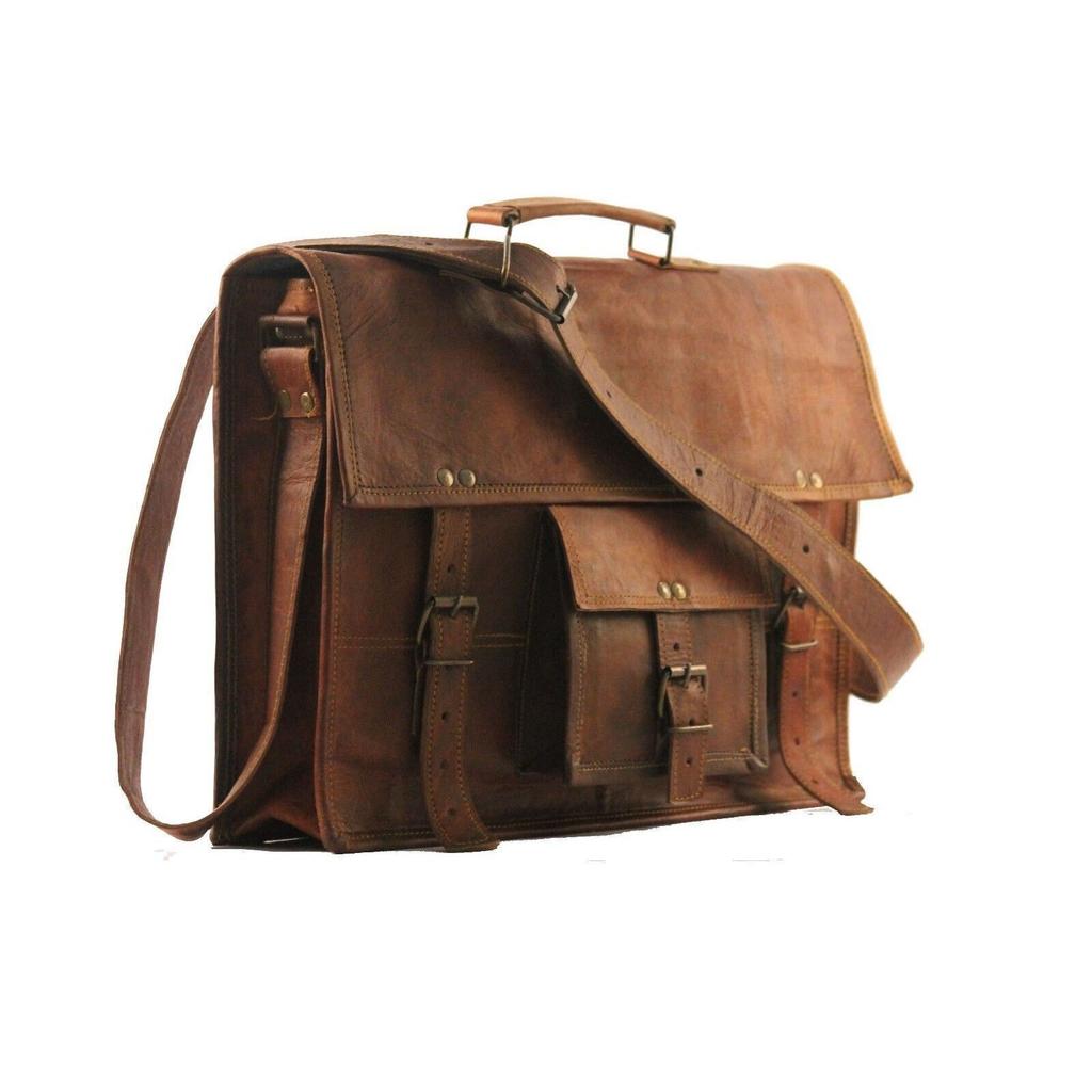 Vintage Genuine Goat Leather Men's Brown Laptop Satchel Messenger Briefcase Bag