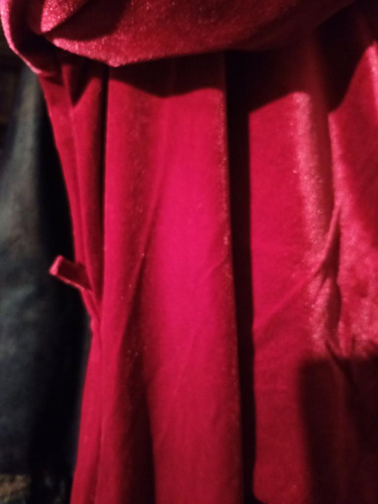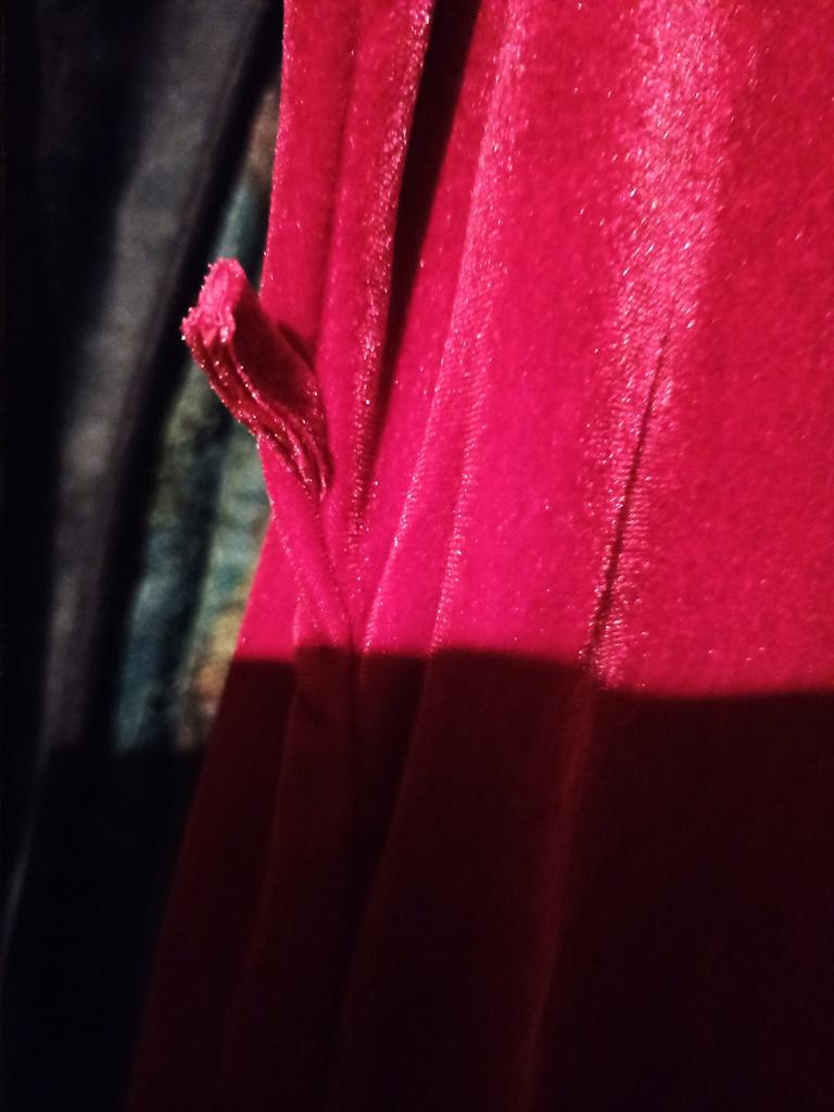 The fabric is beyond praise, the color is like blood. Here is the tailoring, a very deep neckline. Will have to be taken in.
