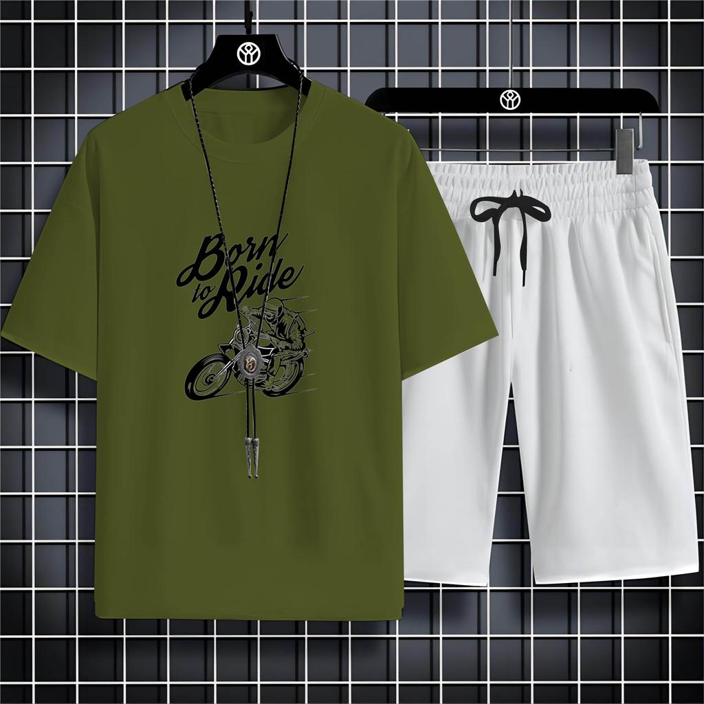 Summer Round Neck Men'S Outdoor Casual 2d Motorcycle Print Loose Comfortable Breathable Short Sleeve T-Shirt Beach Set T-Shirt