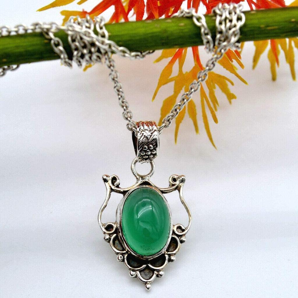 MATERIAL- 925 STERLING SILVER GEMSTONE- Green Onyx Gemstone Wt- 9.97 Cart : Necklace Gross Wt – 9.62 Gms : Necklace Length-21.50 INCH : Stone Shape- Oval CABOCHON : Color – EMERALD GREEN