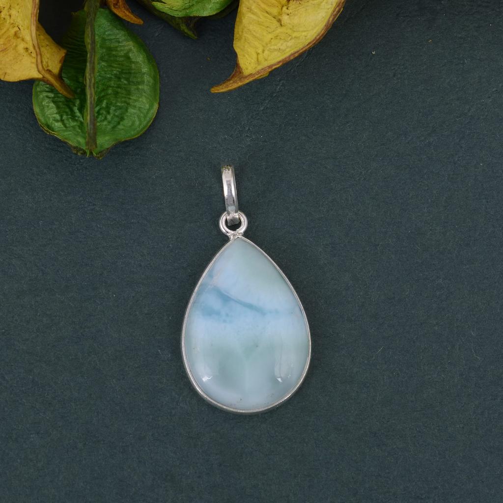 MATERIAL- 925 STERLING SILVER GEMSTONE- Larimar : Silver wt. 3.8 Gms : Pendant Length -1.2" : STONE SHAPE- Pear Cabochon : COLOR – SkyBlue