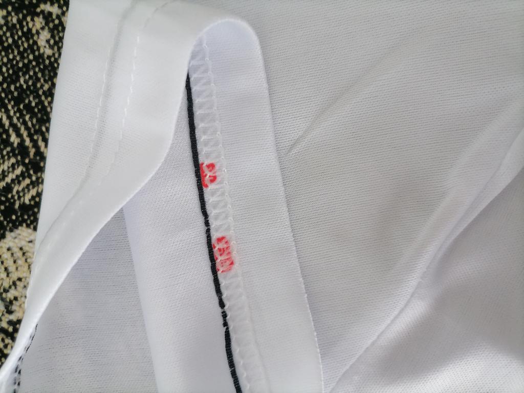 The T-shirt looks very cheap, because the fabric is thin, white jersey, the collar is very stretched.