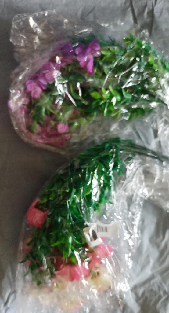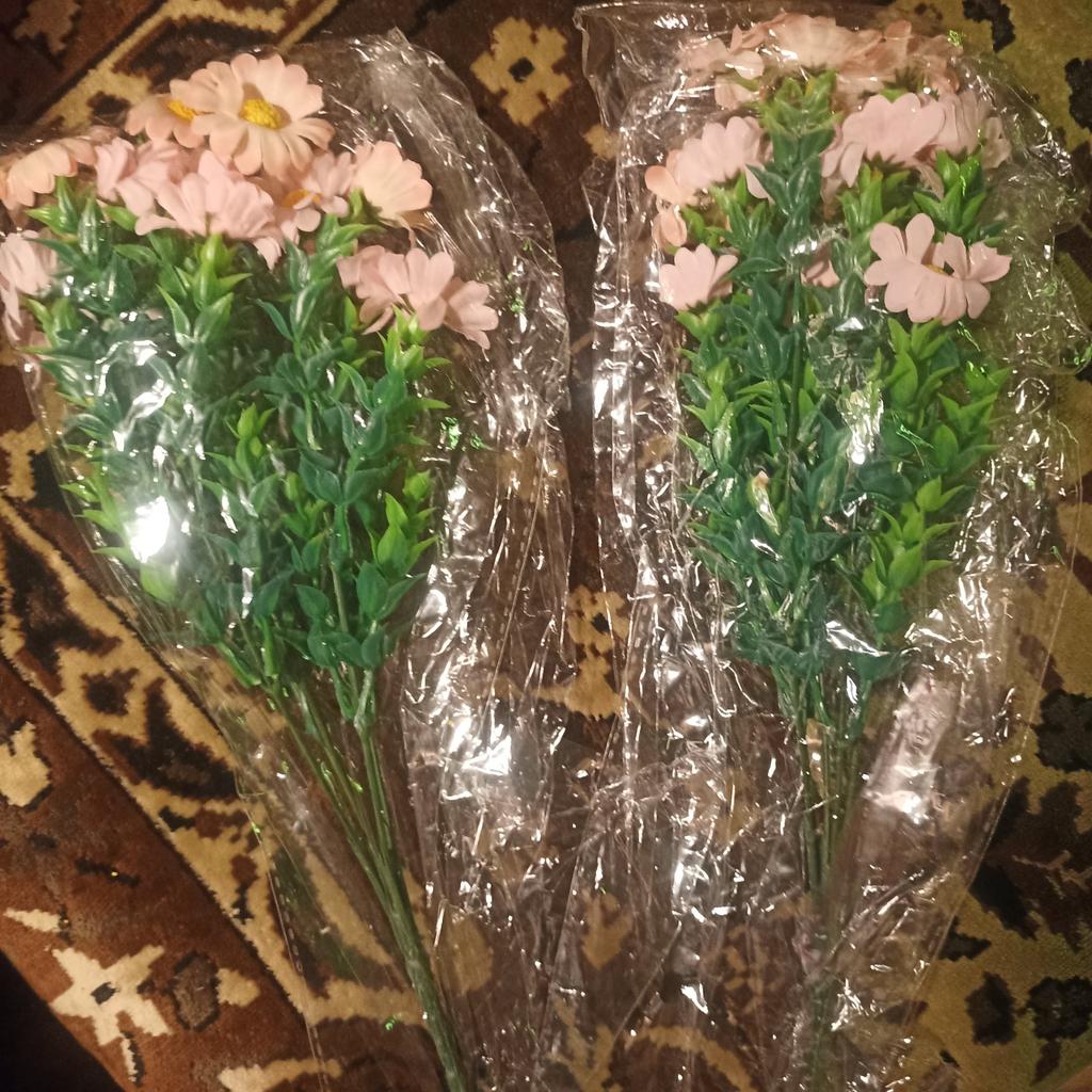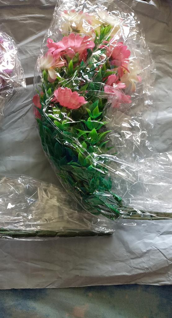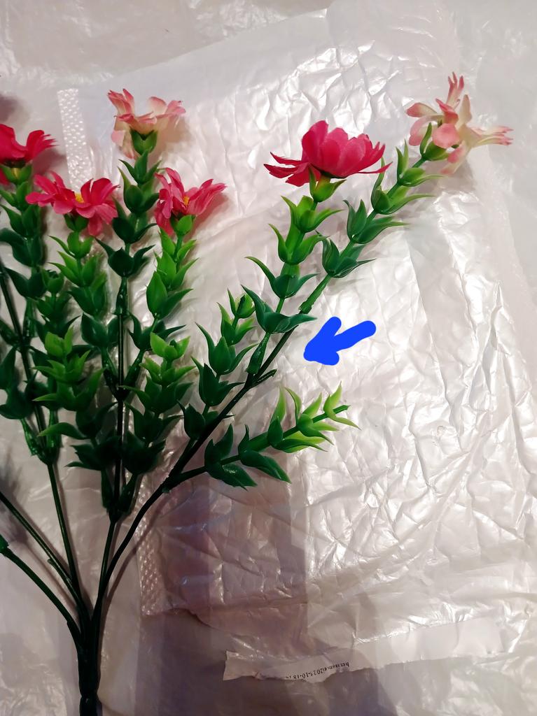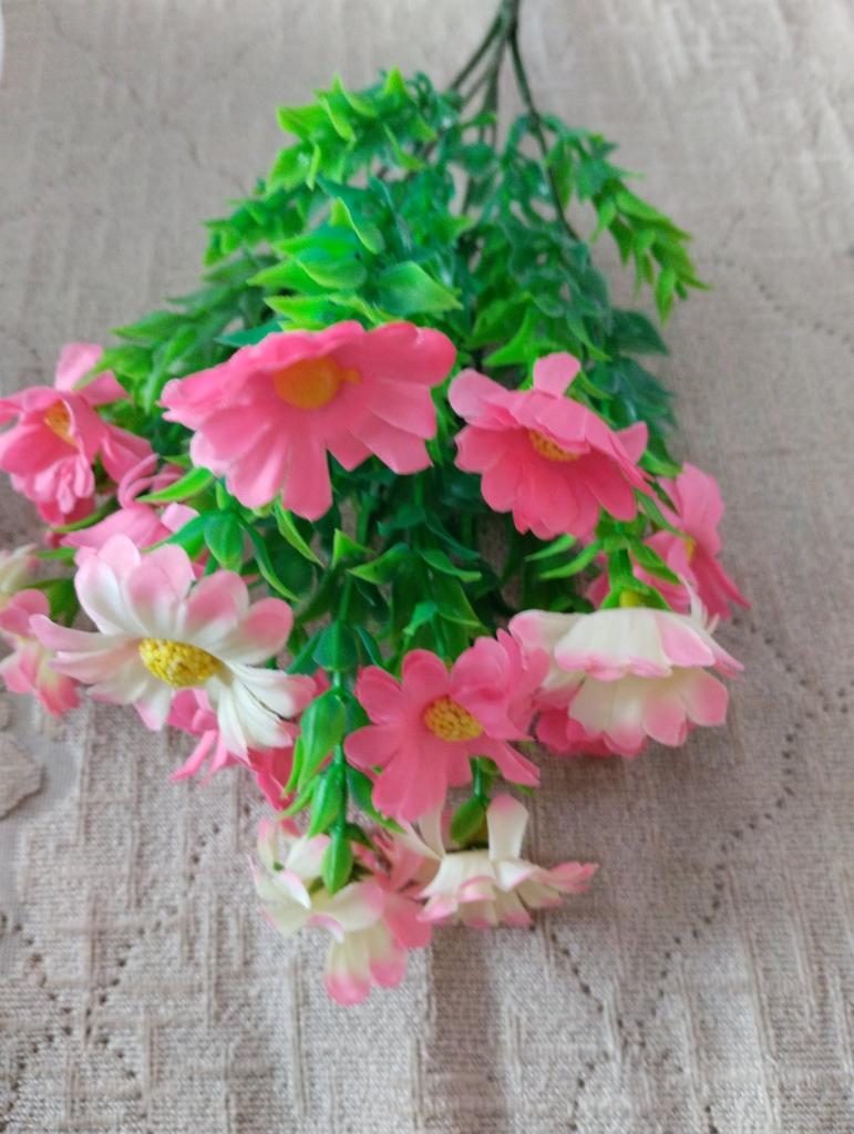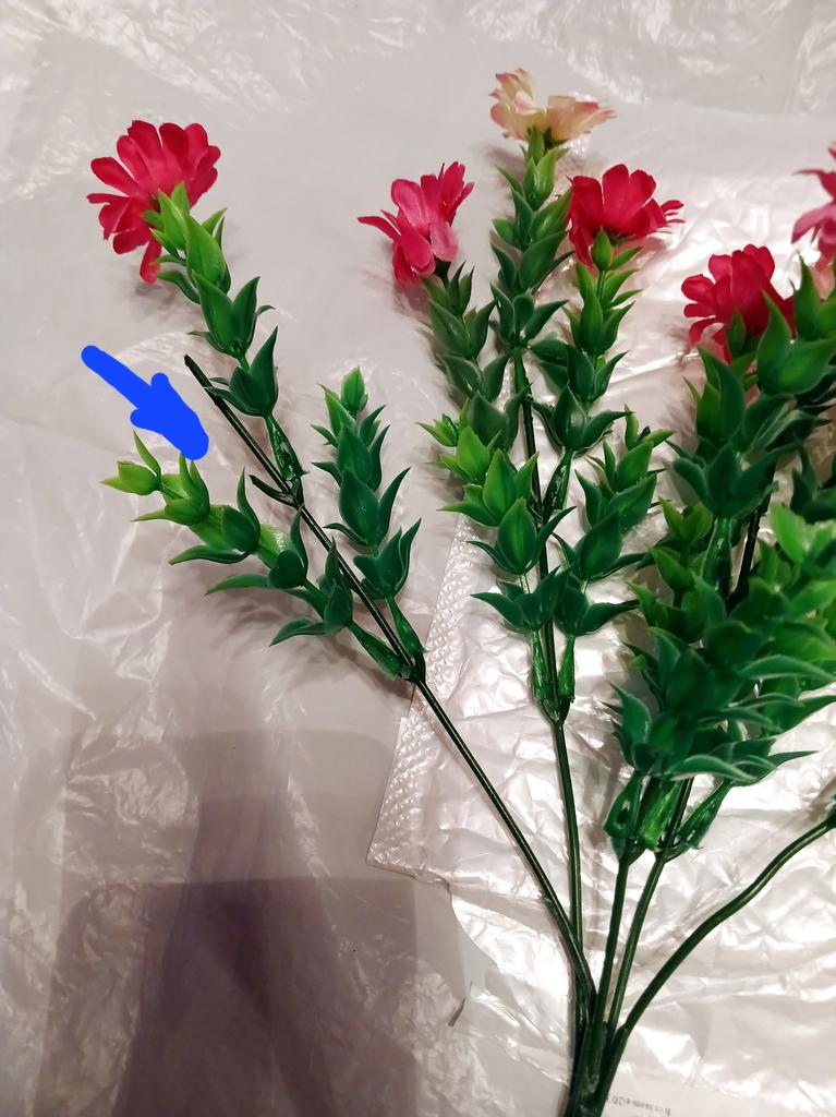 The flowers are beautifully made. They look beautiful. The leaves are plastic, and the flowers themselves are soft, made of fabric. I liked them.